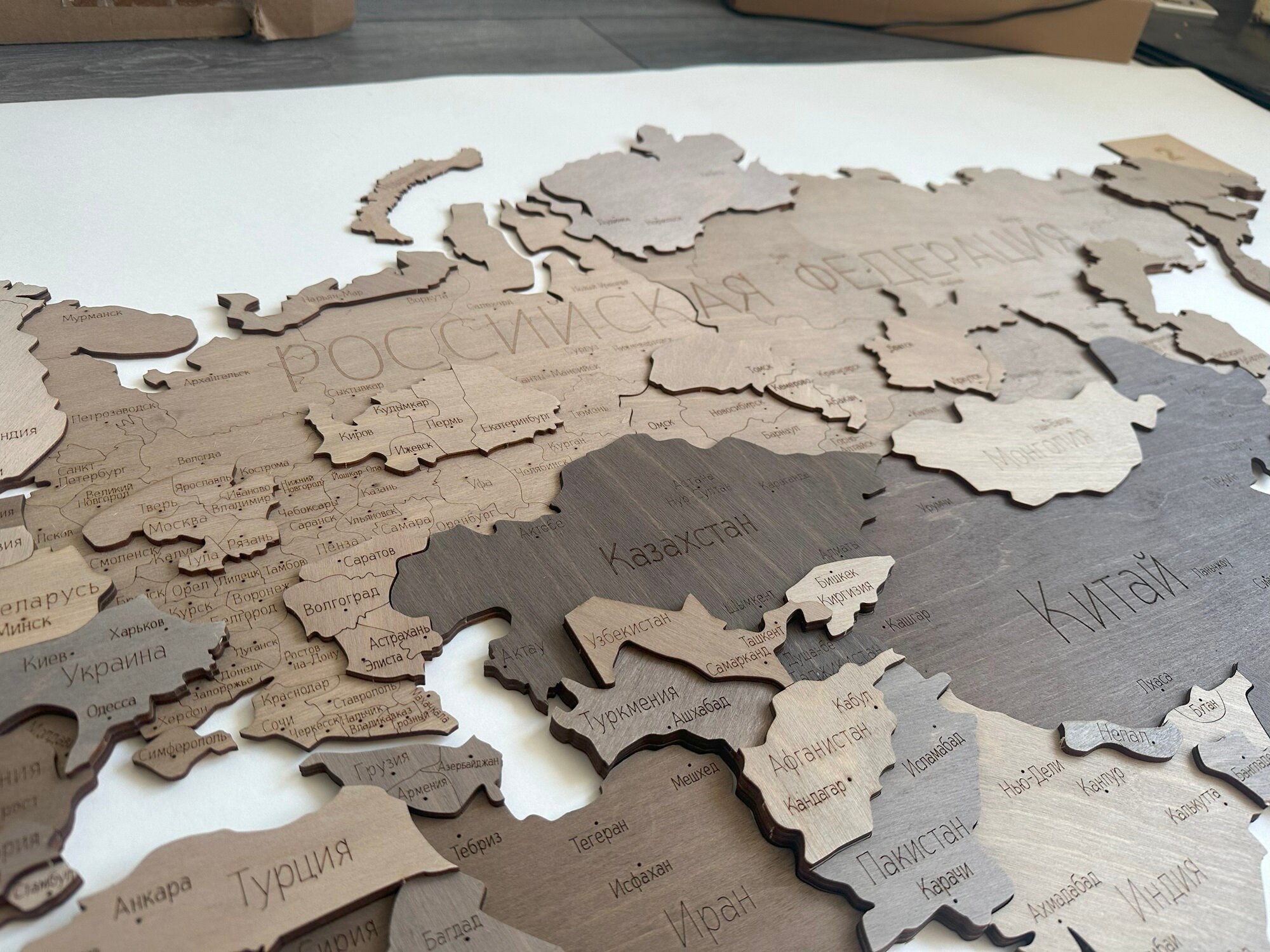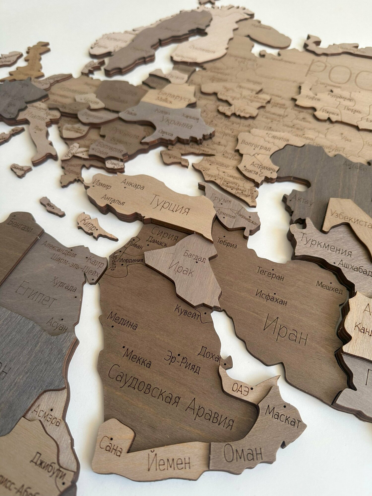 Изготовлена карта из дерева березового шпона. Размер настенной карты 200х120 см. Континенты разделены на части, из которых получается пазл панно. Россия поделена на области и в каждой обозначен его город столица. В комплекте поставляется: 3d карта мира, острова, измерительная планка, инструкция по установке. Покрытие безопасная водная морилка. Интерьерная карта мира отличный топ подарок. Деревянная картина идеально впишется в дизайн интерьера после ремонта как элемент декора в гостиную, кухню, спальню, дачу, офис. Декоративное панно собирается как конструктор. Политическая интерактивная карта крепится на стену (жидкие гвозди) или подложку из оргстекла либо дерева с морями. Подложка упростит монтаж карты, также появится возможность установить подсветку , а металлические держатели отодвинут картину от стены, что придаст объем композиции и создаст эффект парения. Картина на стену из дерева станет центром вашего дома. Географическая изделие подойдет на любой праздник в качестве подарка- мужчине, женщине, друзьям, родственникам, в дом, коллегам по работе, на новоселье, годовщину, день рождения, новый год, 23 февраля. Это изделие из натурального материала не наклейка фотообои обои пластиковые панели. Декор добавит стиля и уюта в ваш дом и станет магнитом для притягивания всей семьи и гостей. 3D карта мира заменит маленьким туристам глобус и атлас. Это полезная картина в детскую, она имеет 3 уровня. Папа и Мама вместе с ребенком, увлеченно будут собирать собственный мир, готовясь к новым путешествиям ведь это целая жизнь, у малыша появится желание повысить уровень образование. Изучение стран превратится в увлекательную развивающую игру. Ищите свой город на нашей карте: Анадырь, Билибино, Среднеколымск, Магадан, Палана, Петропавловск-Камчатский, Якутск, Нерюнгри, Тында, Благовещенск. Биробиджан, Хабаровск, Владивосток, Мирный, Чита, Улан-Удэ, Иркутск, Братск, Тура, Хатанга, Норильск, Дудинка, Красноярск, Кызыл, Горно-Алтайск, Абакан, Кемерово, Томск, Барнаул, Новосибирск, Омск, Тюмень, Нижневартовск, Новый Уренгой, Салехард, Сургут, Ханты-Мансийск, Тюмень, Челябинск, Курган, Екатеринбург, Воркута, Нарьян-Мар, Сыктывкар, Кудымкар, Пермь, Уфа, Оренбург, Самара, Ульяновск, Казань, Ижевск, Йошкар-Ола, Киров, Архангельск, Вологда, Кострома, Нижний Новгород, Чебоксары, Саранск, Пенза, Саратов, Волгоград, Астрахань, Элиста, Махачкала, Грозный, Владикавказ, Нальчик, Черкесск, Сочи, Краснодар, Ростов на Дону, Белгород, Воронеж, Курск, Тамбов, Липецк, Орёл, Брянск, Тула, Рязань, Калуга, Смоленск, Москва, Владимир, Иваново, Тверь, Псков, Ярославль, Вологда, Великий Новгород, Санкт-Петербург, Петрозаводск, Мурманск, Калининград, Симферополь, Херсон, Запорожье, Донецк, Луганск.
