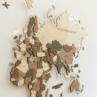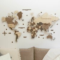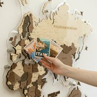 Изделие упаковано в надежную крафтовую коробку, поэтому все содержимое придет целым и невредимым. В комплект также входит подробная инструкция, деревянные кораблики и самолеты, компас, острова и названия океанов. Карта послужит Вам в качестве украшения Вашего интерьера, придаст уют и тепло родному дому. Декоративное изделие будет хорошо смотреться везде: в гостиной, в прихожей, на кухне, столовой, спальне и даже в детской! С помощью интерактивной, физической карты мира Вы можете изучать географию со своими детьми, укрепляя их образование и дома! Для развития школьников чтение карты также обеспечит запоминание стран и городов России. Необязательно иметь книги, глобусы, атлас или политическую карту под рукой, чтобы вспомнить название или местоположение какой-либо страны. Эта большая 3D карта мира будет прекрасным оформлением и декором для Вашего дома! Будь то ваш дом, офис или кафе, она станет настоящим акцентом в любом интерьере и притягательным объектом для гостей. Достаточно будет, сидя в уютном кресле за чашкой чая, обратить внимание на большую географическую карту мира, увлечься ею и провести время с пользой. Географический пазл можно подарить маме, папе, другу, коллеге, любимой, любимому, мужу, жене, для ребенка, школьника, подростка и всем остальным. А также подойдет и на такие праздники, как день рождения, новый год, юбилей, 23 февраля, 8 марта, выпускной, ведь карта пазл имеет универсальную подарочную упаковку. Наша Земля разнообразна и состоит из огромного множества стран, государств и республик, поэтому вся красота ее с географической стороны отображена в нашей карте мира! Выбирайте интерьерное украшение в любой расцветке на свой вкус, нажимая на бренд, в нашем магазине WoodenCountry. Приятных покупок!