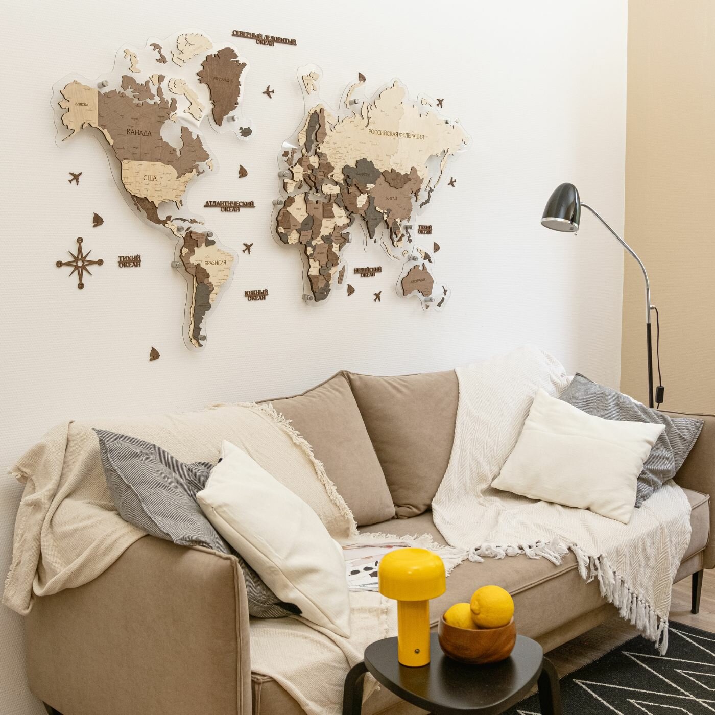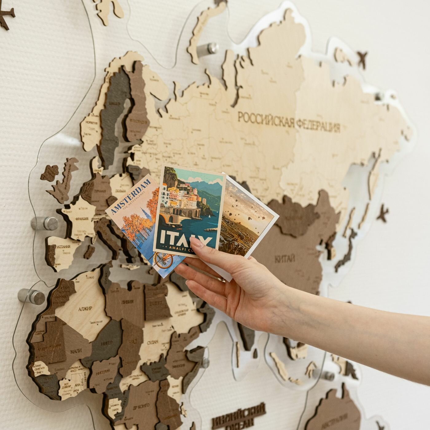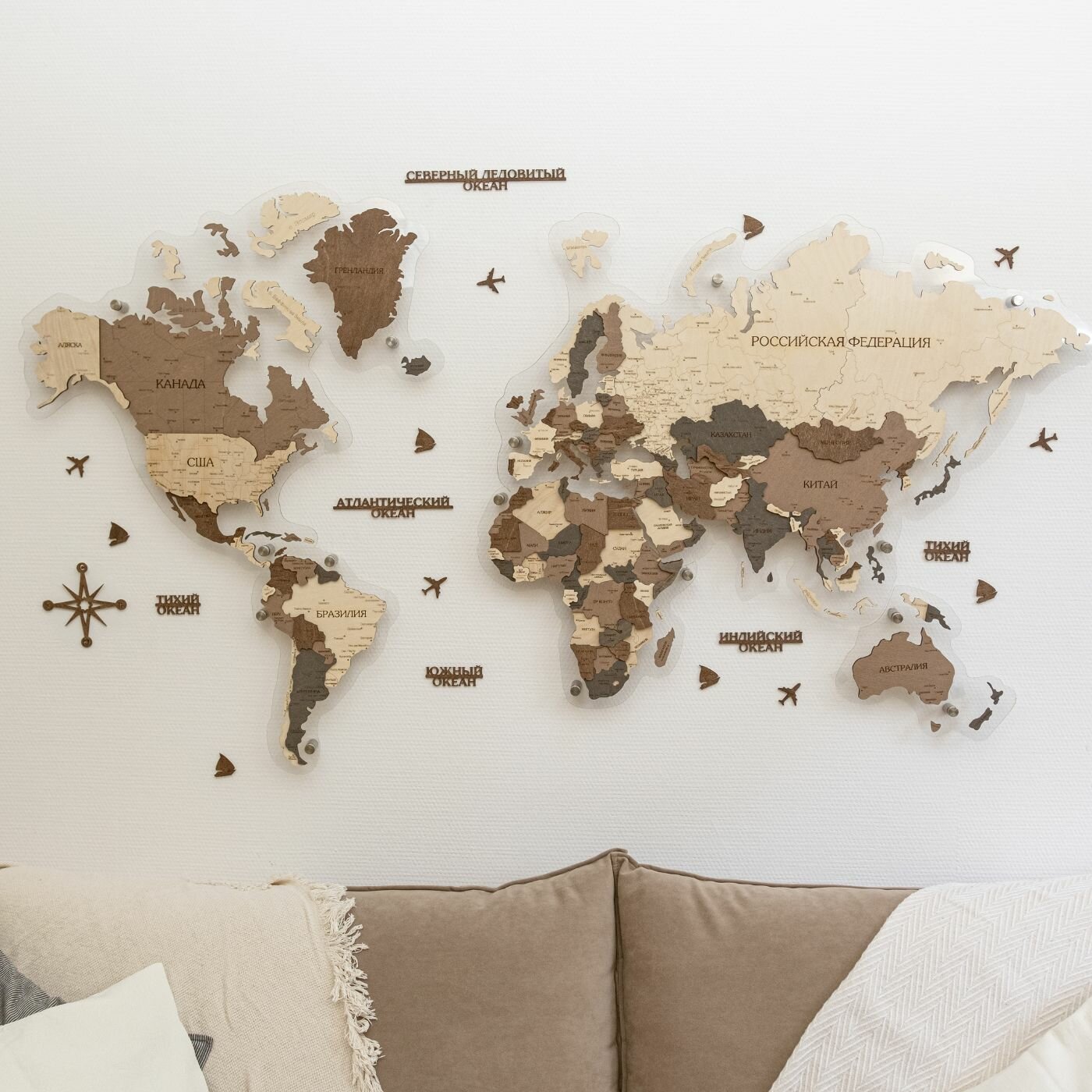 Карта мира настенная на подложке из оргстекла размером 160х100 см изготовлена из дерева высшего сорта, а названия стран, городов, океанов и морей, нанесены с помощью лазерной гравировки. В наличии представлено разнообразное сочетание цветов, поэтому можно выбрать наиболее подходящее для вашего интерьера. А в качестве украшения карты вам помогут наши подарки - известные деревянные достопримечательности и красные геометки! С помощью них вы сможете прикреплять фотографии из путешествий, чтобы запечатлеть приятные моменты жизни!