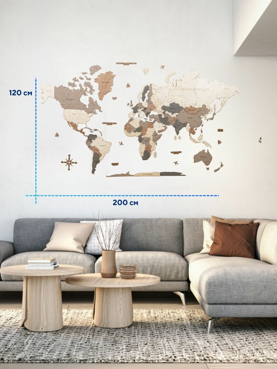 Карта мира настенная размером 200х120 см изготовлена из дерева высшего сорта, а названия стран, городов, океанов и морей, нанесены с помощью лазерной гравировки. В наличии представлено разнообразное сочетание цветов, поэтому можно выбрать наиболее подходящее для вашего интерьера. А в качестве украшения карты вам помогут наши подарки - известные деревянные достопримечательности и красные геометки! С помощью них вы сможете прикреплять фотографии из путешествий, чтобы запечатлеть приятные моменты жизни! Деревянную карту легко и увлекательно собирать всей семьей, так как карта выполнена в виде пазла и крепится на стену с помощью двухстороннего акрилового скотча, который мы советуем отделять аккуратно, с помощью канцелярского ножа или пинцета. Изделие упаковано в надежную крафтовую коробку, поэтому все содержимое придет целым и невредимым. В комплект также входит подробная инструкция, деревянные кораблики и самолеты, компас, острова и названия океанов. Карта послужит Вам в качестве украшения Вашего интерьера, придаст уют и тепло родному дому. Декоративное изделие будет хорошо смотреться везде: в гостиной, в прихожей, на кухне, столовой, спальне и даже в детской! С помощью интерактивной, физической карты мира Вы можете изучать географию со своими детьми, укрепляя их образование и дома! Для развития школьников чтение карты также обеспечит запоминание стран и городов России. Необязательно иметь книги, глобусы, атлас или политическую карту под рукой, чтобы вспомнить название или местоположение какой-либо страны. Эта большая 3D карта мира будет прекрасным оформлением и декором для Вашего дома! Будь то ваш дом, офис или кафе, она станет настоящим акцентом в любом интерьере и притягательным объектом для гостей. Достаточно будет, сидя в уютном кресле за чашкой чая, обратить внимание на большую географическую карту мира, увлечься ею и провести время с пользой. Географический пазл можно подарить маме, папе, другу, коллеге, любимой, любимому, мужу, жене, для ребенка, школьника, подростка и всем остальным. А также подойдет и на такие праздники, как день рождения, новый год, юбилей, 23 февраля, 8 марта, выпускной, ведь карта пазл имеет универсальную подарочную упаковку. Наша Земля разнообразна и состоит из огромного множества стран, государств и республик, поэтому вся красота ее с географической стороны отображена в нашей карте мира! Выбирайте интерьерное украшение в любой расцветке на свой вкус, нажимая на бренд, в нашем магазине WoodenCountry. Приятных покупок!