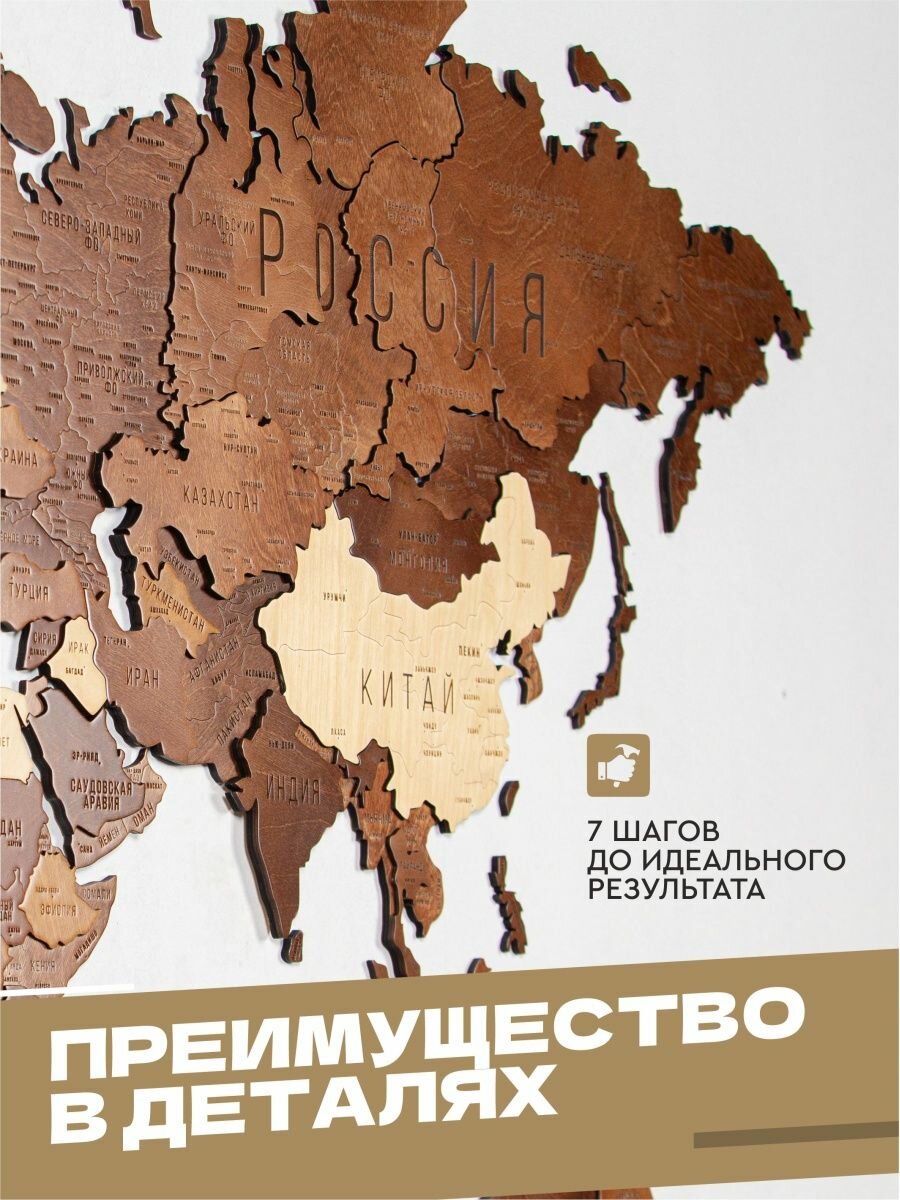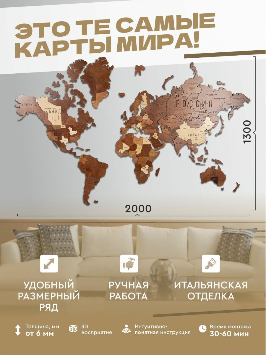 Да это те самые первые в мире премиальные карты из дерева! Остерегайтесь подделок! Создана удивлять, образовывать, и невероятно дополнять интерьер. Отборный шпон, итальянская прозрачная отделка, ручная работа. При создании цветовых решений в помощь было взято несколько десятков журналов с самыми крутыми интерьерами. Листая страницы, было выписано несколько десятков максимально часто встречающихся цветов. После чего мы соединили их между собой так, что бы карта будто вливалась в мебельный ансамбль вашего дома, квартиры, офиса, была центром притяжения, и одновременно не тянуть как говорится на себя одеяло.99.9% Ваших гостей скажут ВАУ. 0,1% Просто еще не были у вас в гостях ).