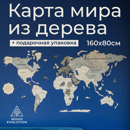 Двухуровневая большая деревянная географическая карта мира, цвет Gray Stone. Выполнена в виде пазла с детализацией границ стран, столиц и крупных городов. Размер 160х80 см, нанесена качественная лазерная гравировка на русском языке. Карта объемная (толщина фанеры 4 и 6 мм), состоит из разных стран, республик и государств земли. Выполнена из натурального экологичного березового шпона высшего сорта и покрыта органическими маслами разной тональности, произведенными в США. Крепление производится на стену(можно на обои), всё, что нужно для сборки и установки имеется в комплекте. Для установки карты на дистанционные держатели необходимо приобрести подложку (Артикул: 108381999 - натуральная), (Артикул: 162920682- океан). Произведена в России. Комплектация карты из дерева: липкая лента, подробная инструкция по сборке и установке, качественная подарочная упаковка, фирмаенный вкладыш из бумаги, стикеры геометки из эпоксидной смолы (+ кораблики, самолётики, подводные лодки и вырезанные названия океанов). Она интерактивная и вполне может заменить атлас или глобус, политическую карту. Послужит как декор комнаты, заменит фотообои, картину, скретч карту, постер или плакат. Настенная карта будет замечательным подарком на новый год, к школе, к 1 сентября для детей, школьника, подростка, ребенка, девочки, мальчика, мамы, папы и подойдёт как подарок учительнице. Малыши смогут изучать по ней географию и готовиться к школе, карта обеспечивает динамичное развитие ребёнка в повседневной жизни. В доме и в детской она замечательно дополнит дизайн интерьера как декоративное украшение. Подарочный пазл подойдет для планирования путешествий. 3d интерьерное украшение.
