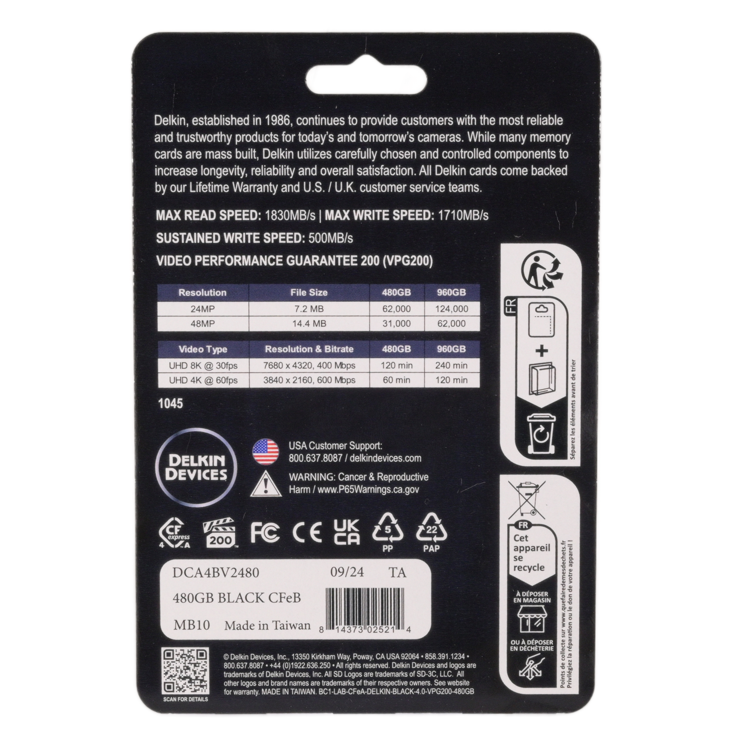 Карта памяти 480 ГБ BLACK CFexpress Type A 4.0 от Delkin Devices, сочетающая в себе прочность, надёжность и производительность, имеет объём памяти 480 ГБ и предназначена для профессиональных фотографов, видеооператоров и владельцев высококачественных кинокамер. Она хорошо подходит для съёмки в формате RAW и серийной съёмки, а также для съёмки видео в формате RAW 8K, 6K и 4K с высокой скоростью передачи данных и частотой кадров. Благодаря интерфейсу PCIe вы сможете достичь максимальной скорости чтения до 1830 МБ/с, максимальной скорости записи до 1710 МБ/с и минимальной устойчивой скорости записи 500 МБ/с. Кроме того, эта карта соответствует спецификации VPG-200, что означает, что скорость записи гарантированно не опустится ниже 200 МБ/с.