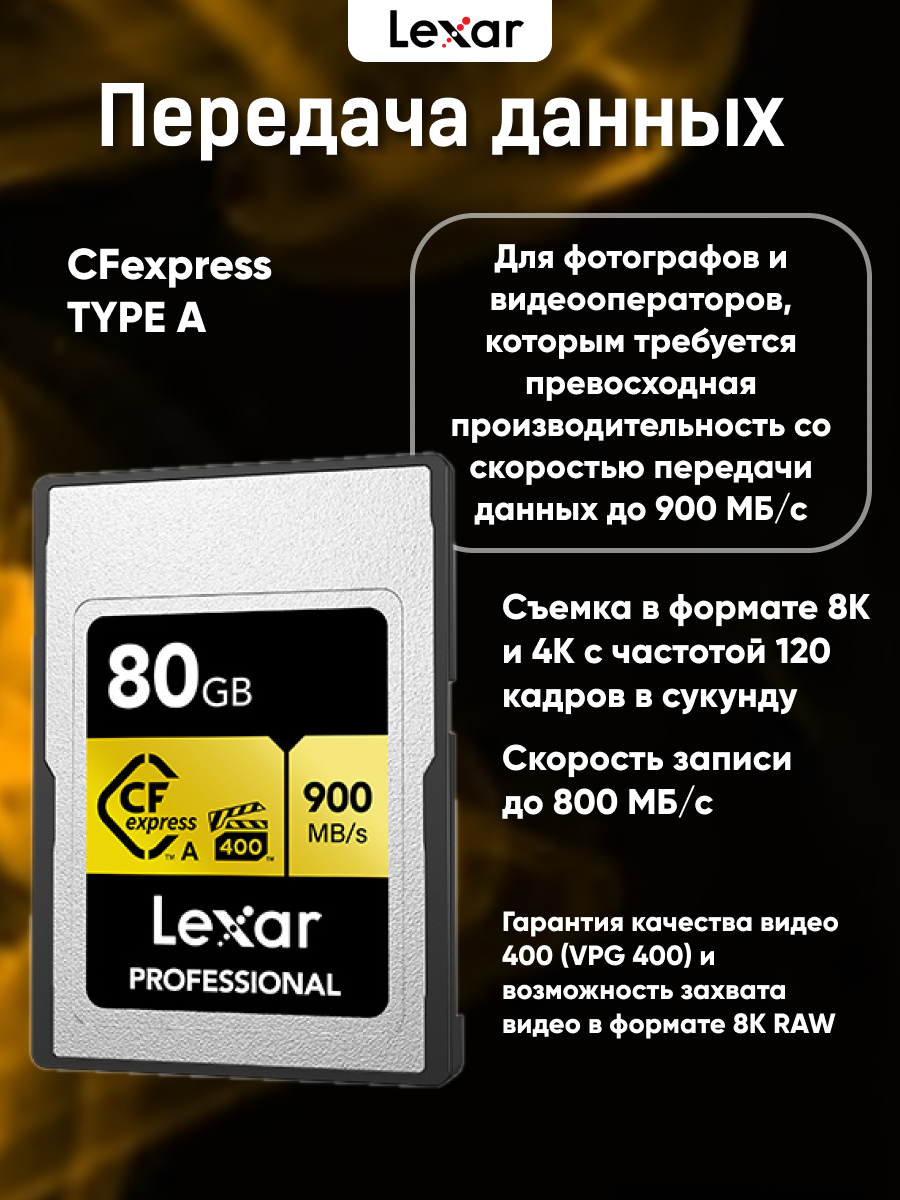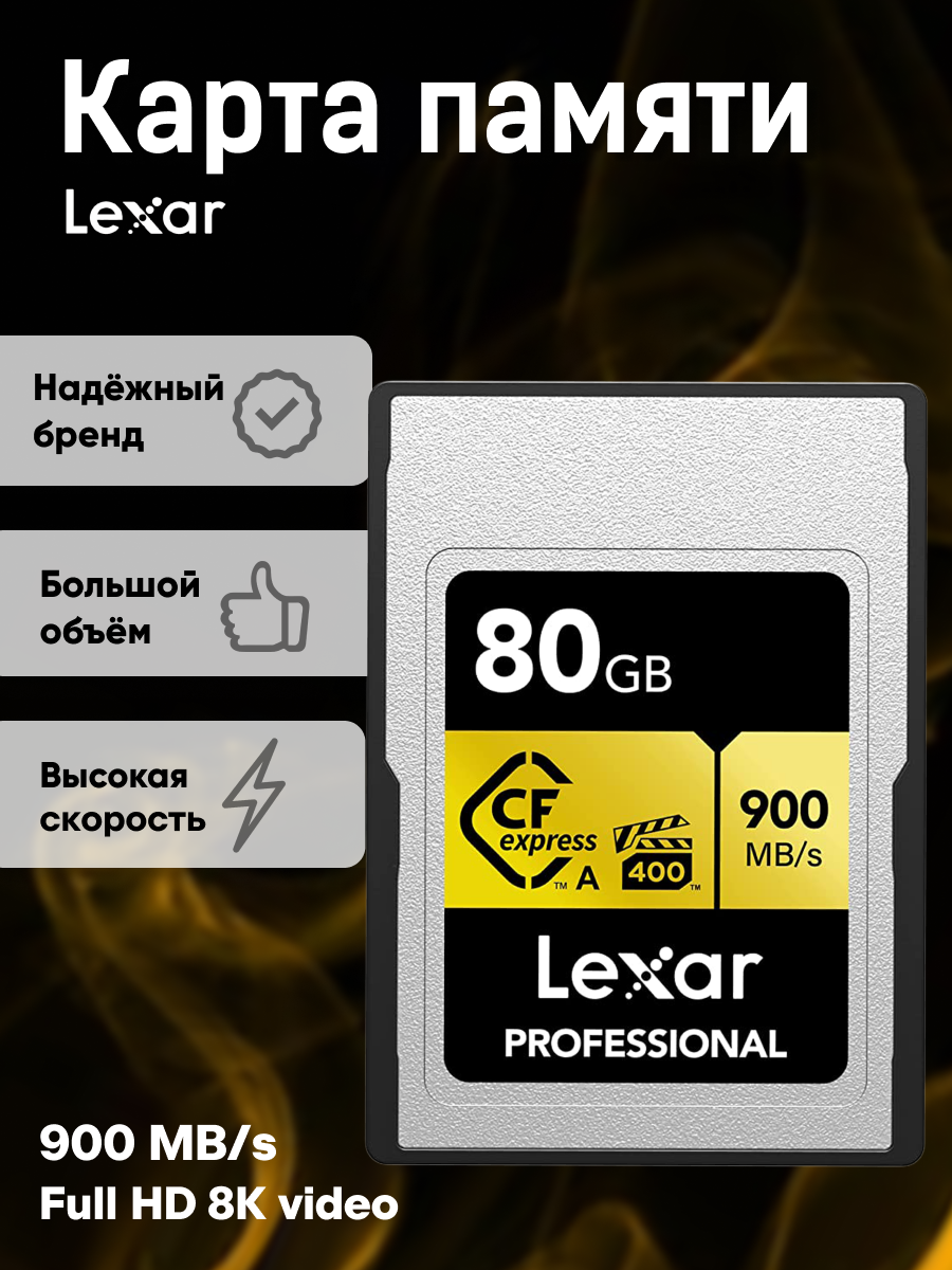 Созданная для профессиональных авторов, которые хотят снимать изображения с высоким разрешением и видео 8K кинематографического качества, профессиональная карта CFexpress Type A GOLD Series емкостью 80 ГБ от Lexar обеспечивает скорость чтения до 900 МБ/с и скорость записи до 800 МБ/с. и минимальная скорость записи 700 МБ/с. Все это позволяет снимать видео в форматах 8K Raw, 4K и HFR со скоростью до 120 кадров в секунду, а также фотографии в формате RAW и серийные изображения. Кроме того, он соответствует стандарту видеокласса VGP-400, гарантирующему скорость записи не менее 400 МБ/с. Чтобы защитить ваши данные, компания Lexar разработала эту карту так, чтобы она выдерживала температуры в диапазоне от 14 до 158°, а также удары и вибрацию.