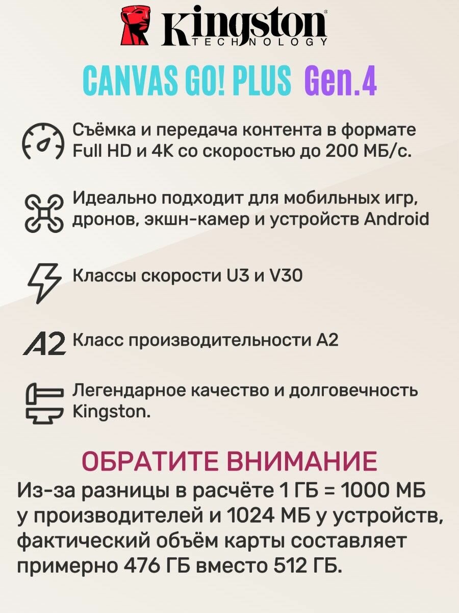 Карта памяти microSD 512 ГБ Kingston Canvas Go! Plus Gen.4 Class 10 UHS-I U3 V30 A2 200 Мб/с, без адаптера SDCG4/512GBSP: сравнение цен, характеристики, фото, актуальное наличие и цены.