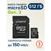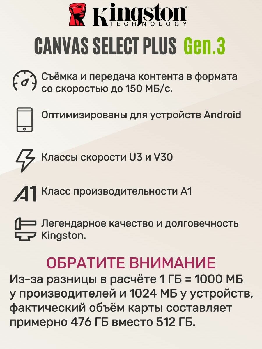 Карта памяти microSD 512 ГБ Kingston Canvas Select Plus Gen.3 Class 10 SDCS3/512GB UHS-I U3 V30 A1 150 Мб/с, c адаптером: сравнение цен, характеристики, фото, актуальное наличие и цены.