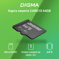 Карта памяти microSDXC UHS-I U1 Digma 64 ГБ, 70 МБ/с, Class 10, CARD10, 1 шт, переходник SD [dgfca064a01]