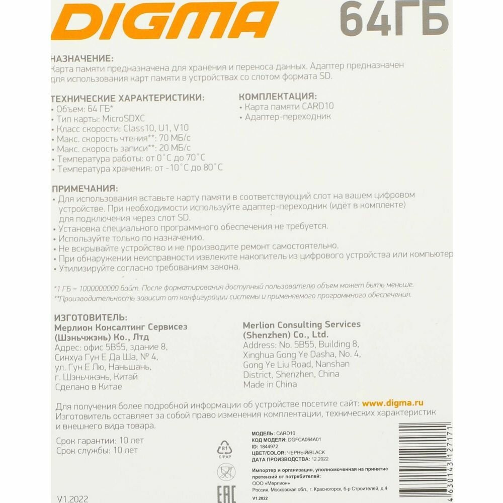 Карта памяти Digma microSDXC 64Gb Class 10 UHS-I U1 + ADP: сравнение цен, характеристики, фото, актуальное наличие и цены.