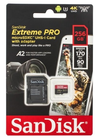 Карта памяти SanDisk 256GB Extreme Pro MicroSDXC 170MB/s A2 V30 UHS-I U3 + adapter (SDSQXCZ-256G-GN6MA): сравнение цен, характеристики, фото, актуальное наличие и цены.