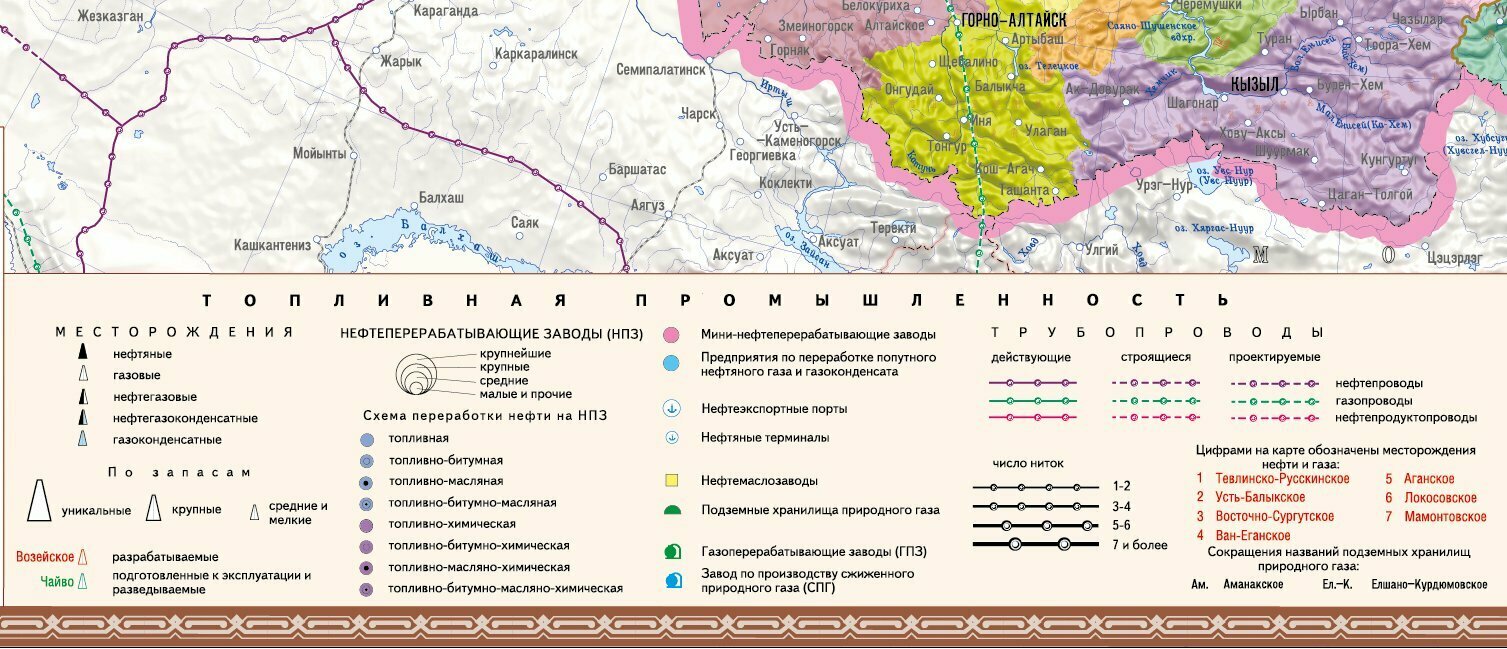 Карта составлена на основании всех современных сведений о развитии нефтяной промышленности, путей ее транспортировки до перерабатывающих комплексов и нефтепроводов. Система магистральных нефтепроводов, нефтеналивные терминалы, водные пути изображены с учетом строящихся и проектируемых. Карта полностью соответствует современным требованиям к картографии, снабжена сноской с условными обозначениями, связанными со спецификой тематики.