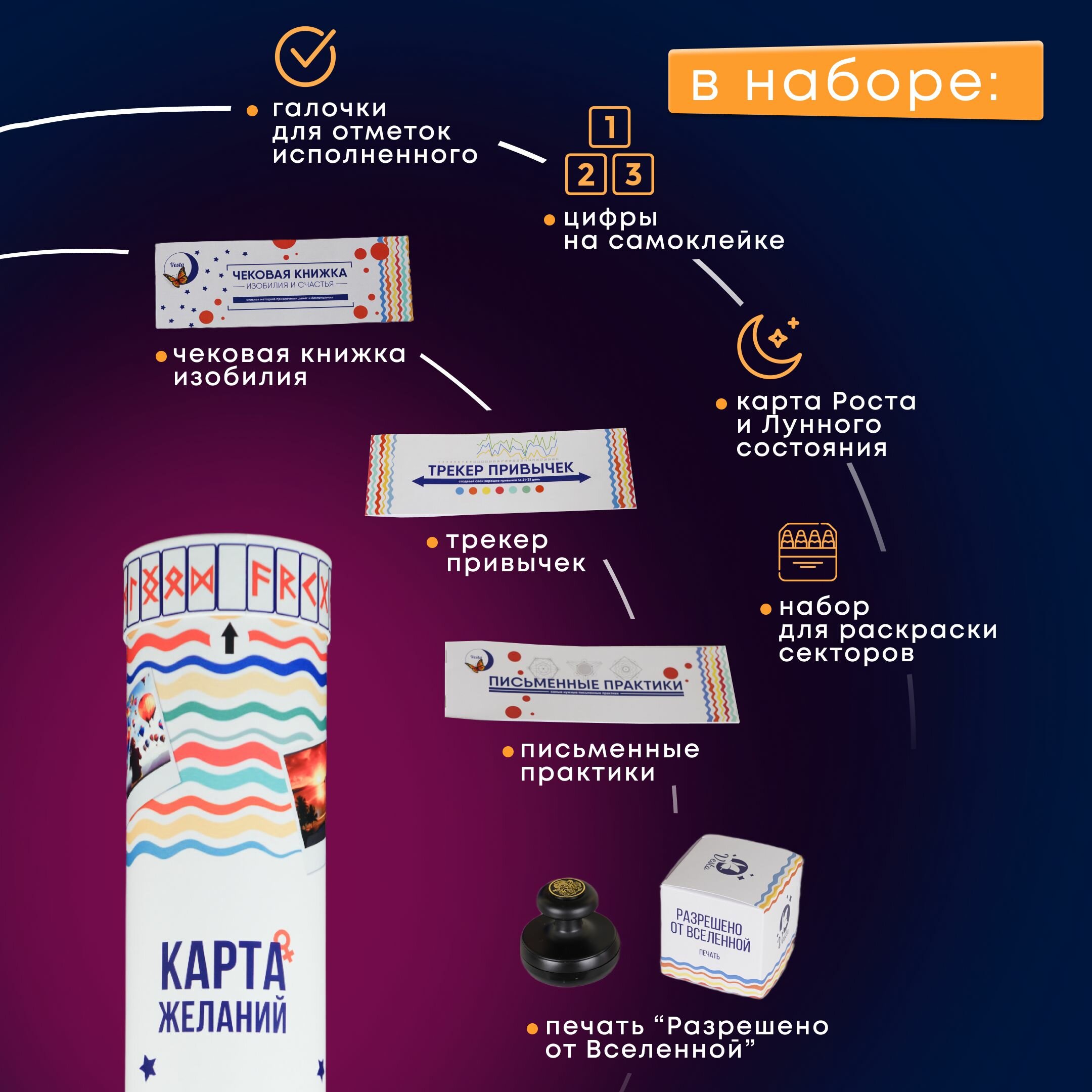 | Подробная комплектация | тубус картонный - 1 шт; лист А2 -1 шт; лист А4 поле - 1 шт; 27 листов самоклеящихся наклеек; инструкция - 1 шт; лунный календарь - 1 шт; карта роста - 1 шт; карта лунного состояния - 1 шт; руническая подсказка - 1 шт; колесо предсказаний - 1шт; печать разрешено от вселенной - 1 шт; чековая книжка изобилия - 1 шт; трекер привычек - 1 шт; письменные практики - 1 шт; дневник благодарности - 1 шт; карандаши набор для раскрашивания - 12 шт; цифры на самоклеящейся основе - 1 шт; галочки на самоклейке - 1 шт; свеча из вощины - 1 шт |