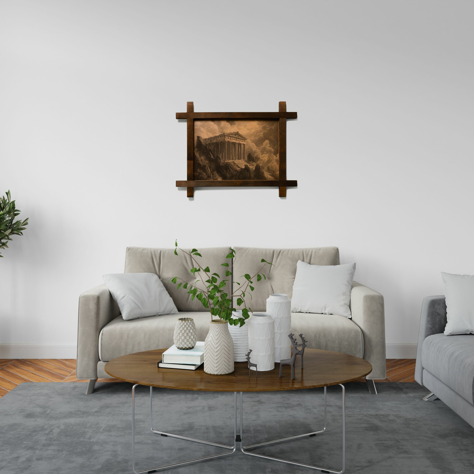 Картина "Древнегреческий храм на горе", гравировка на натуральной коже, интерьерная для украшения и декора на стену в деревянной раме, подарок, BoomGift