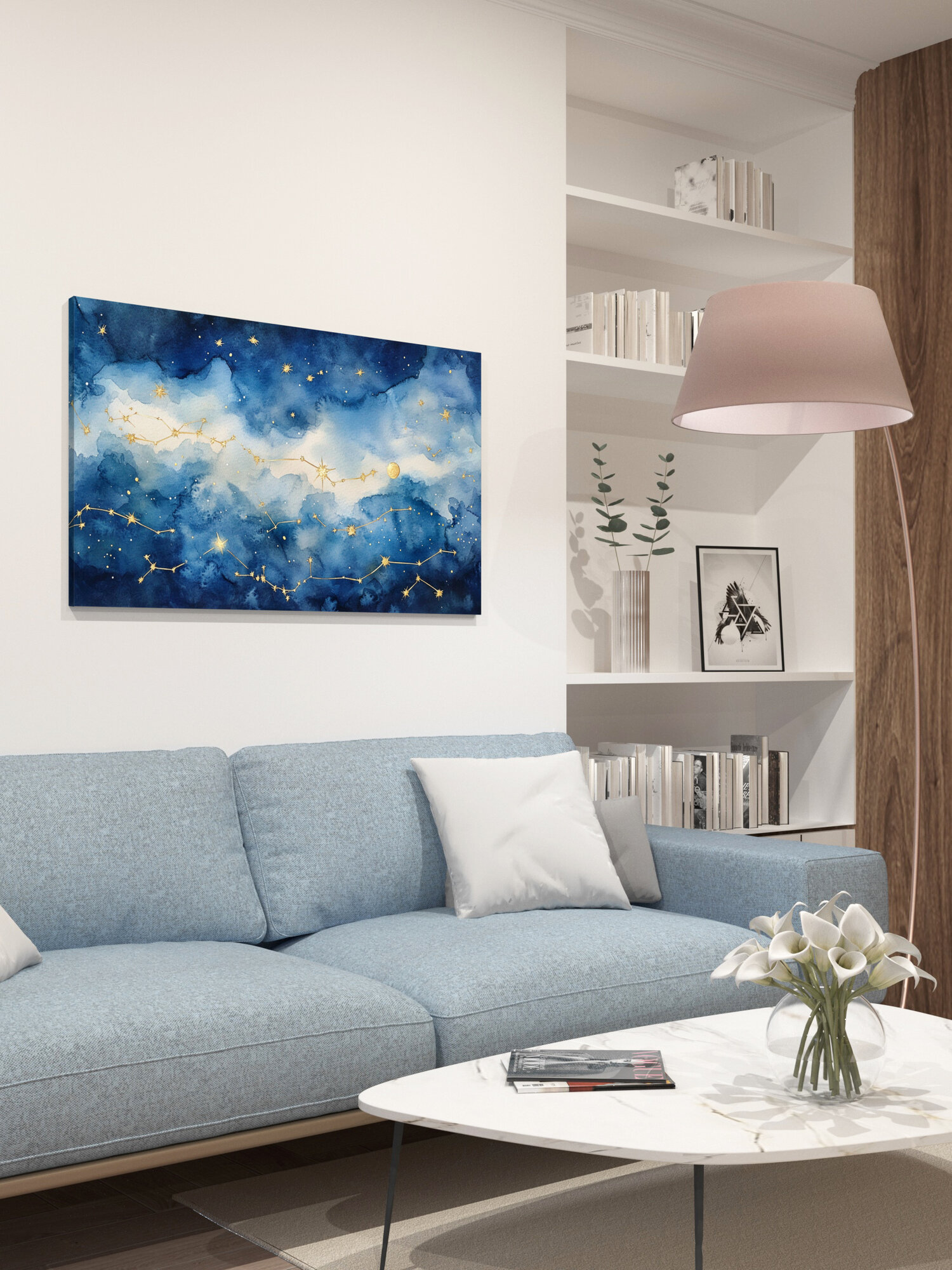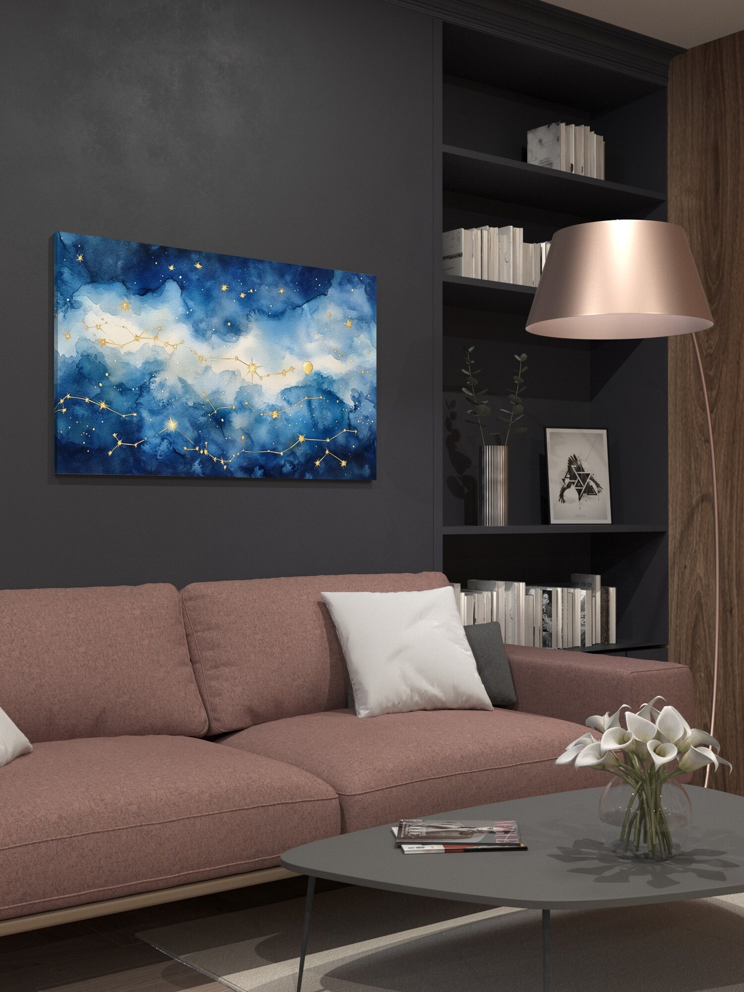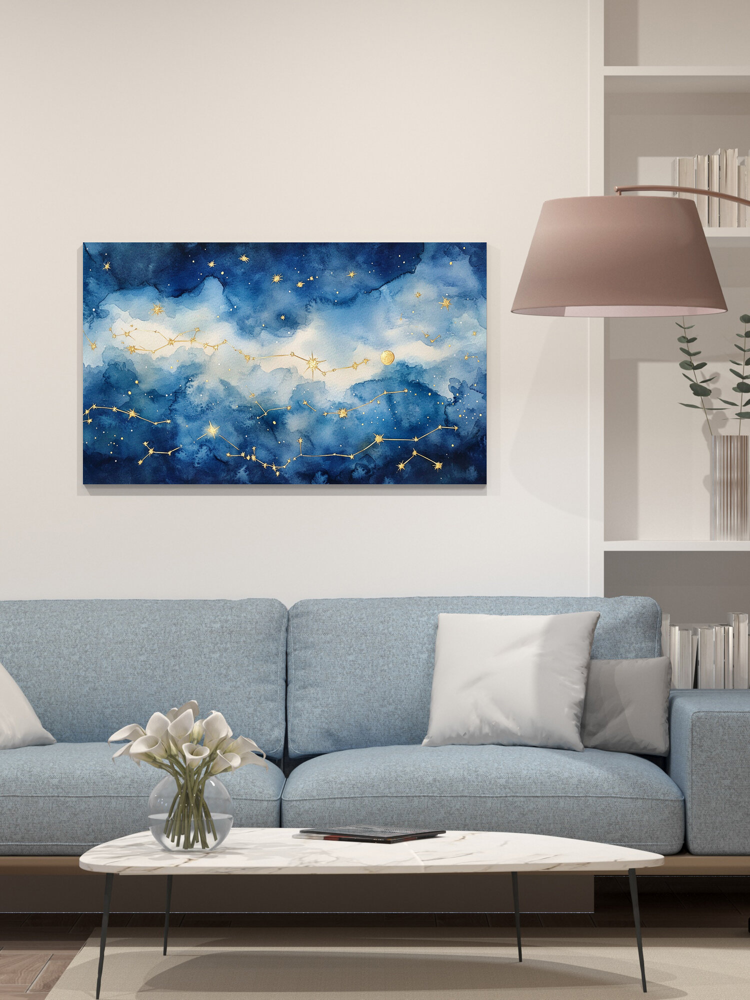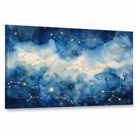 Купить Картина на холсте интерьерная 100х60 см, акварель, ночное небо, созвездия, знаки зодиака, мерцающие, нежные мазки кисти с доставкой по всей России.