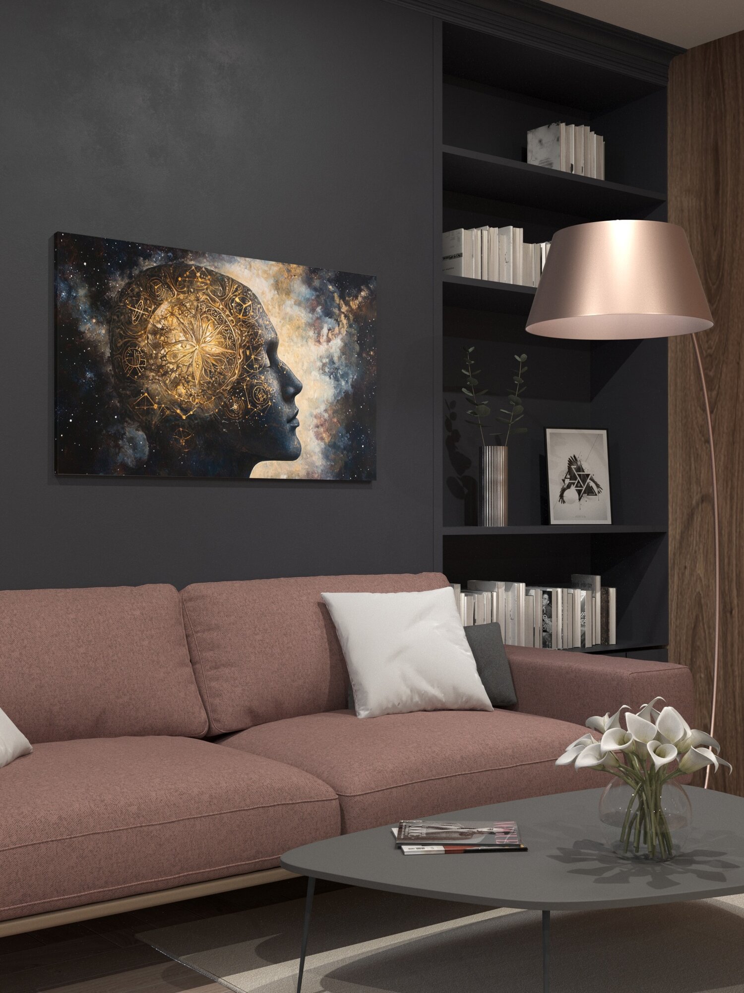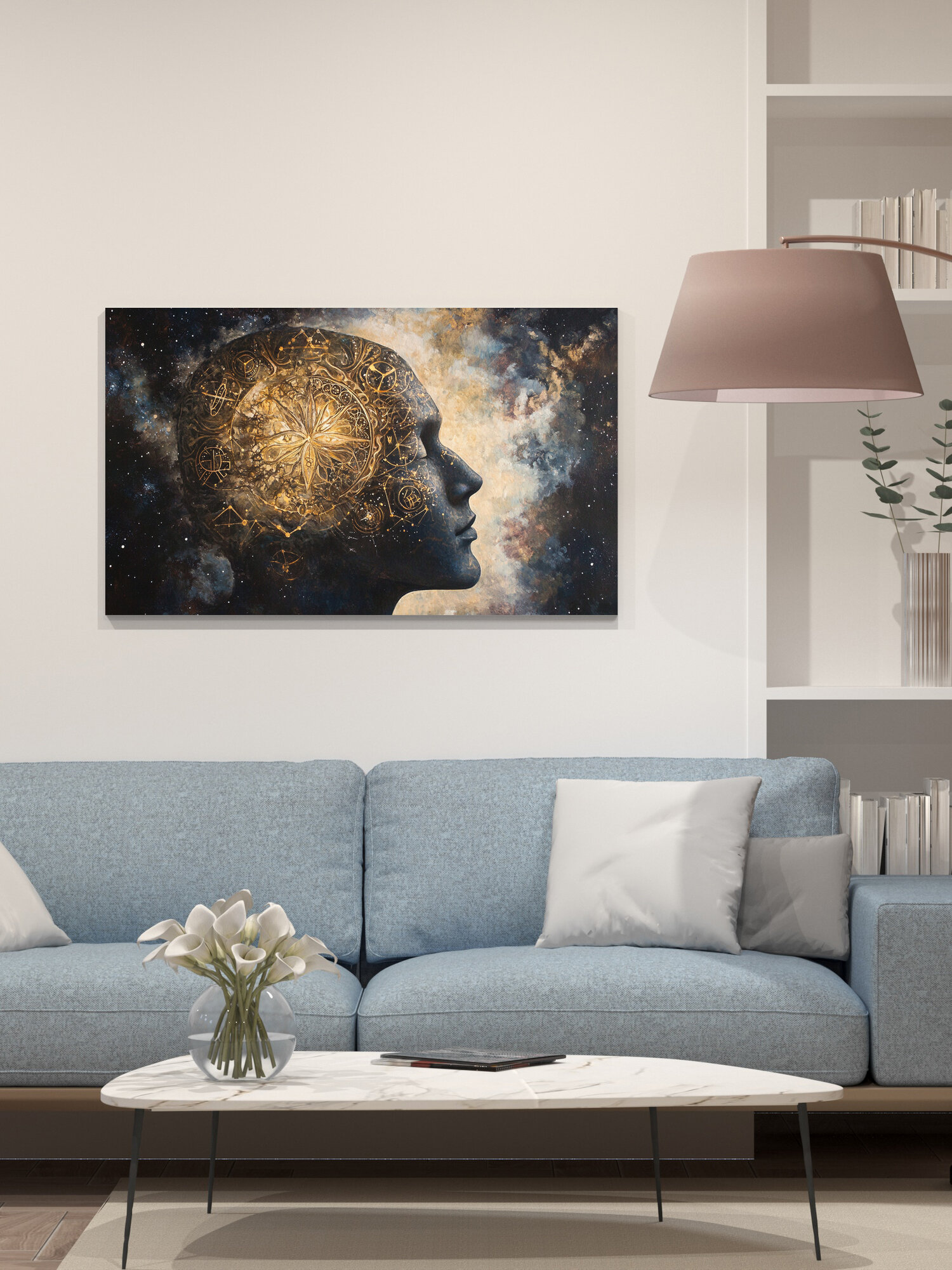 Купить Картина на холсте интерьерная 100х60 см, картина, масло, небесное существо, лицо, символы зодиака, звездное небо, свет с доставкой по всей России.