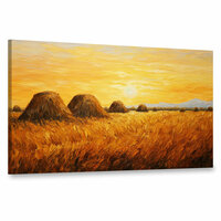 Купить Картина на холсте интерьерная 100х60 см, картина маслом, золотистые оттенки, поля, стога сена, небо, свет и тени с доставкой по всей России.