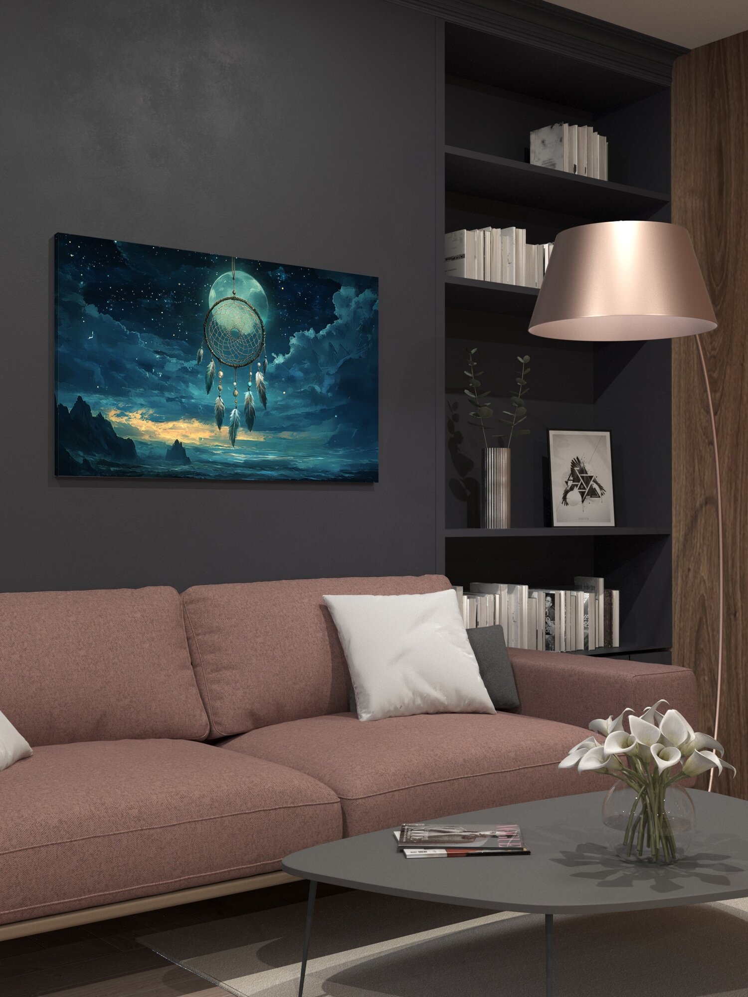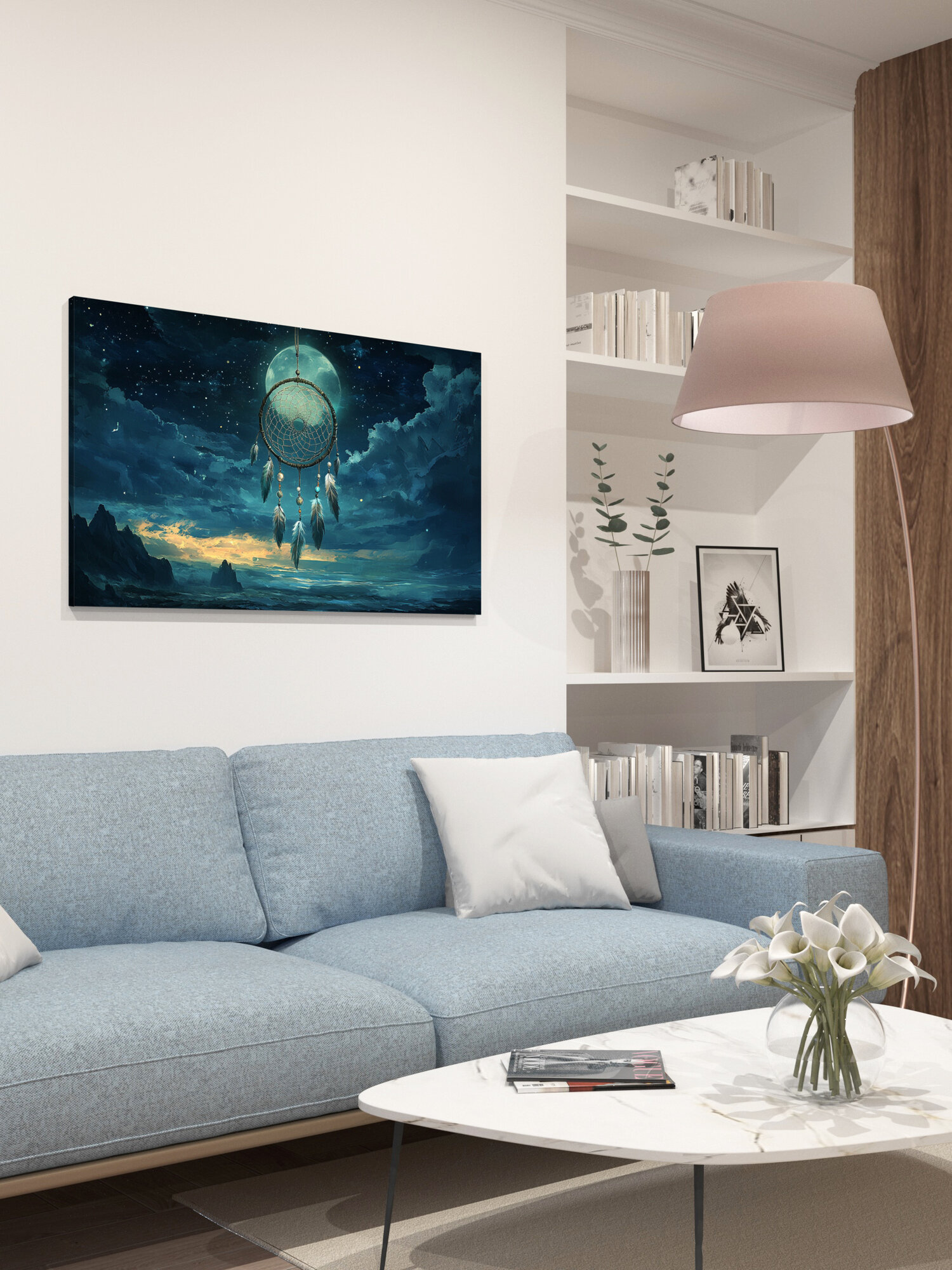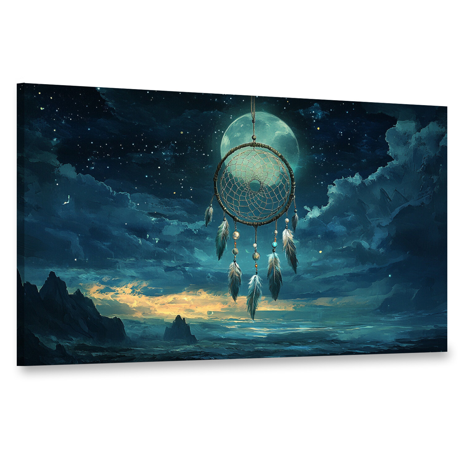 Купить Картина на холсте интерьерная 100х60 см, ловец снов, мистический, цифровая картина, перья, бисер, звездное ночное небо с доставкой по всей России.