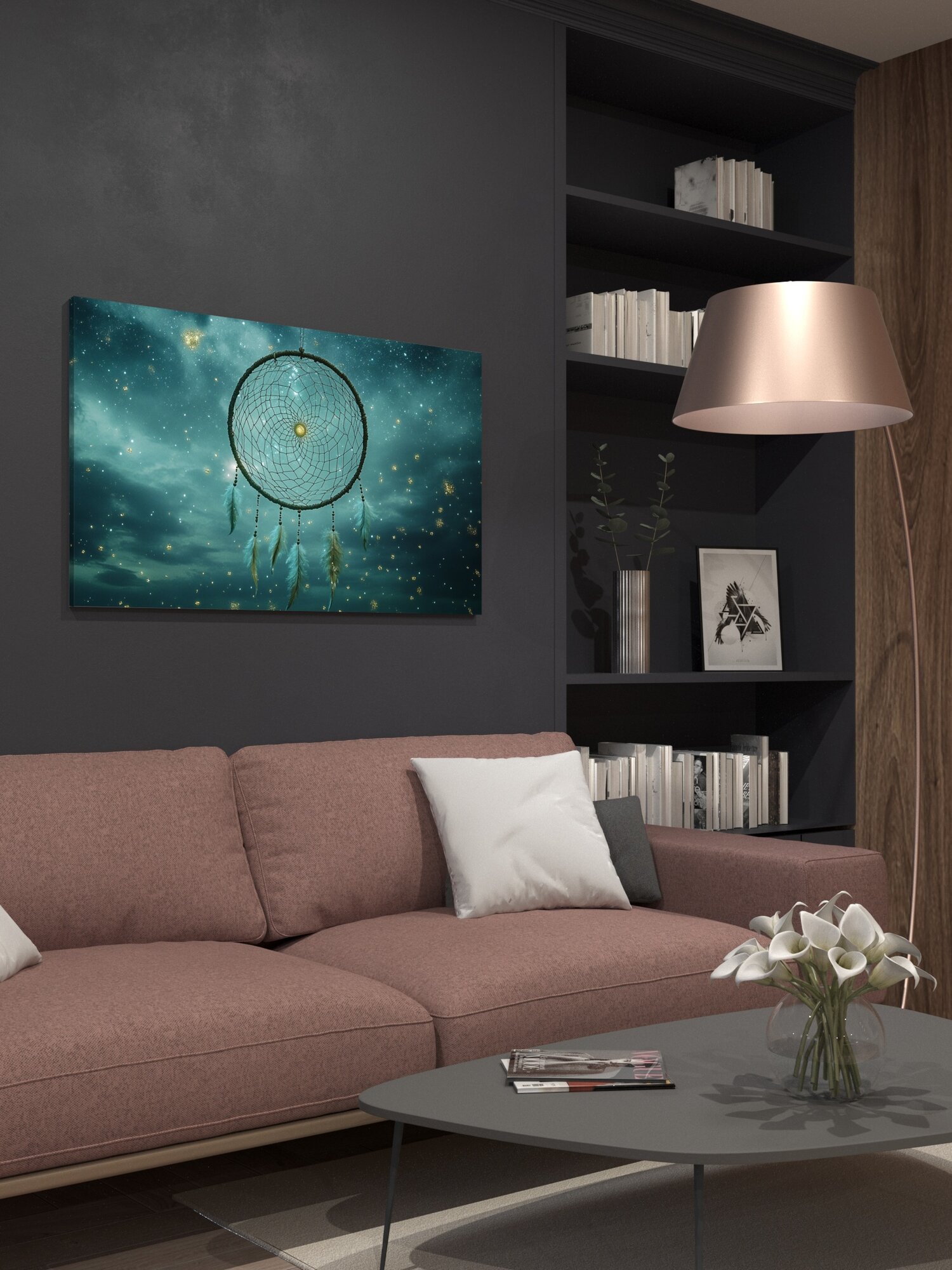 Купить Картина на холсте интерьерная 100х60 см, ловец снов, сюрреализм, звездное небо, мириады снов, паутина, перья, бусины с доставкой по всей России.
