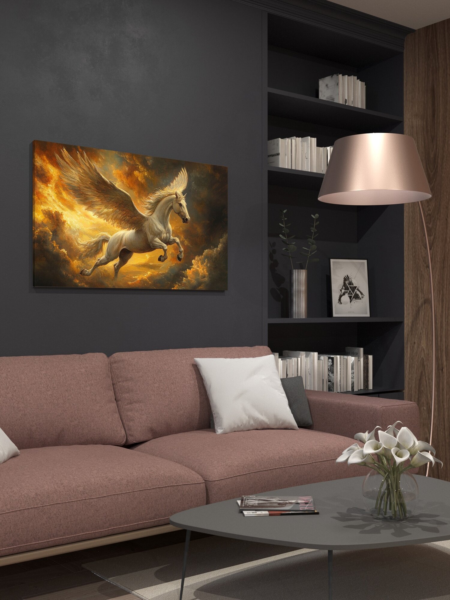 Купить Картина на холсте интерьерная 100х60 см, Пегас, крылатый конь, масляная картина, живописное небо, мощные крылья с доставкой по всей России.
