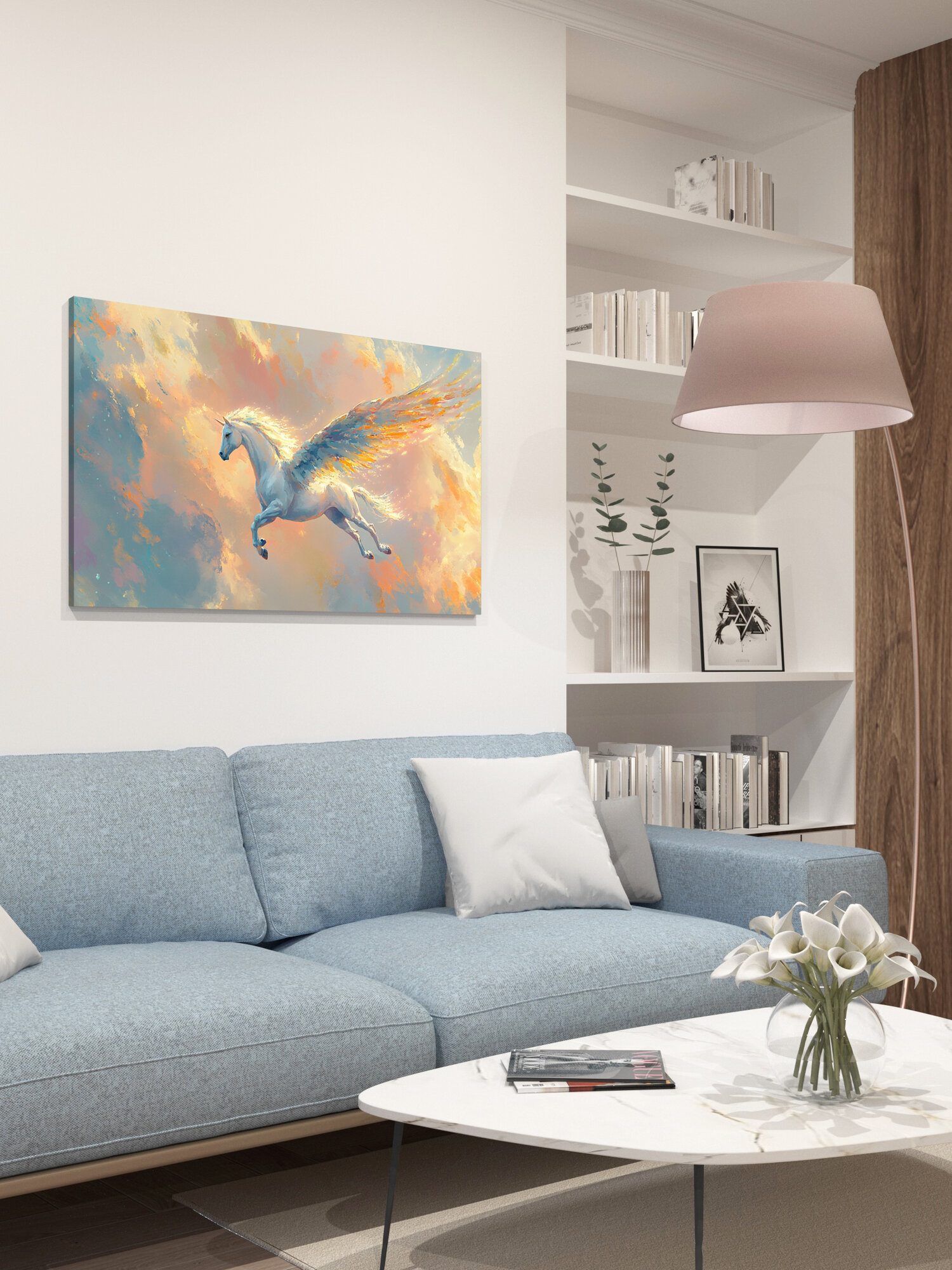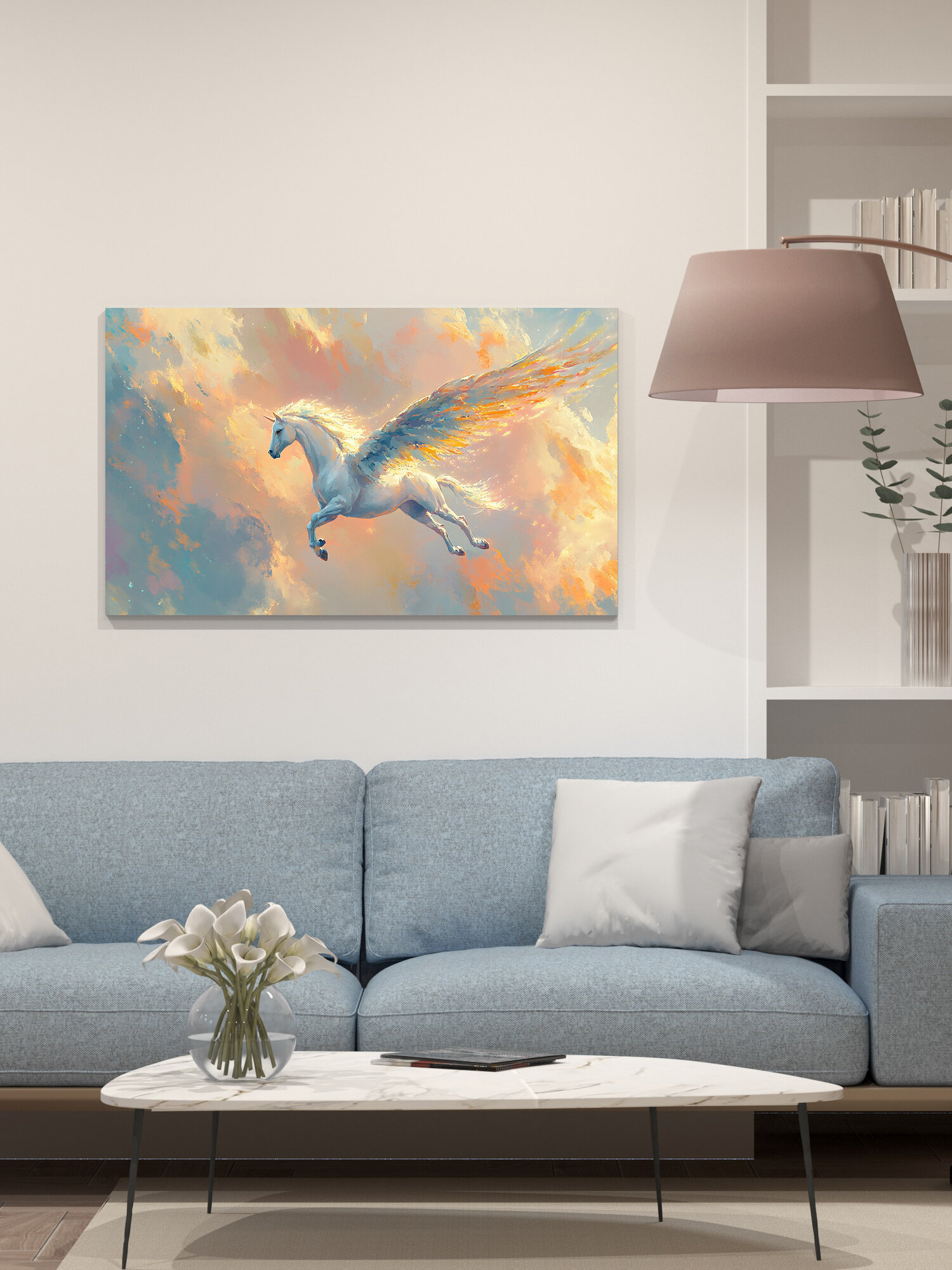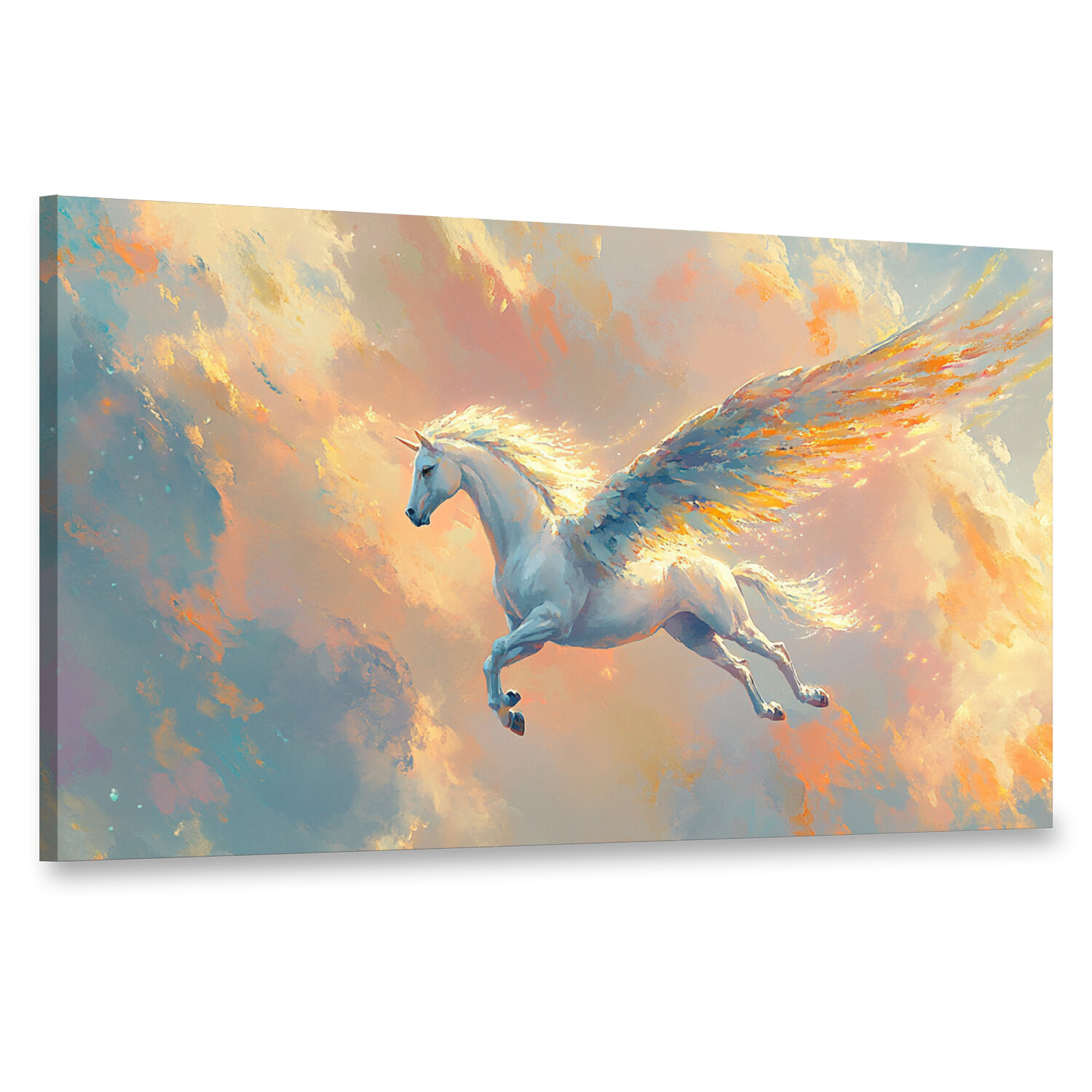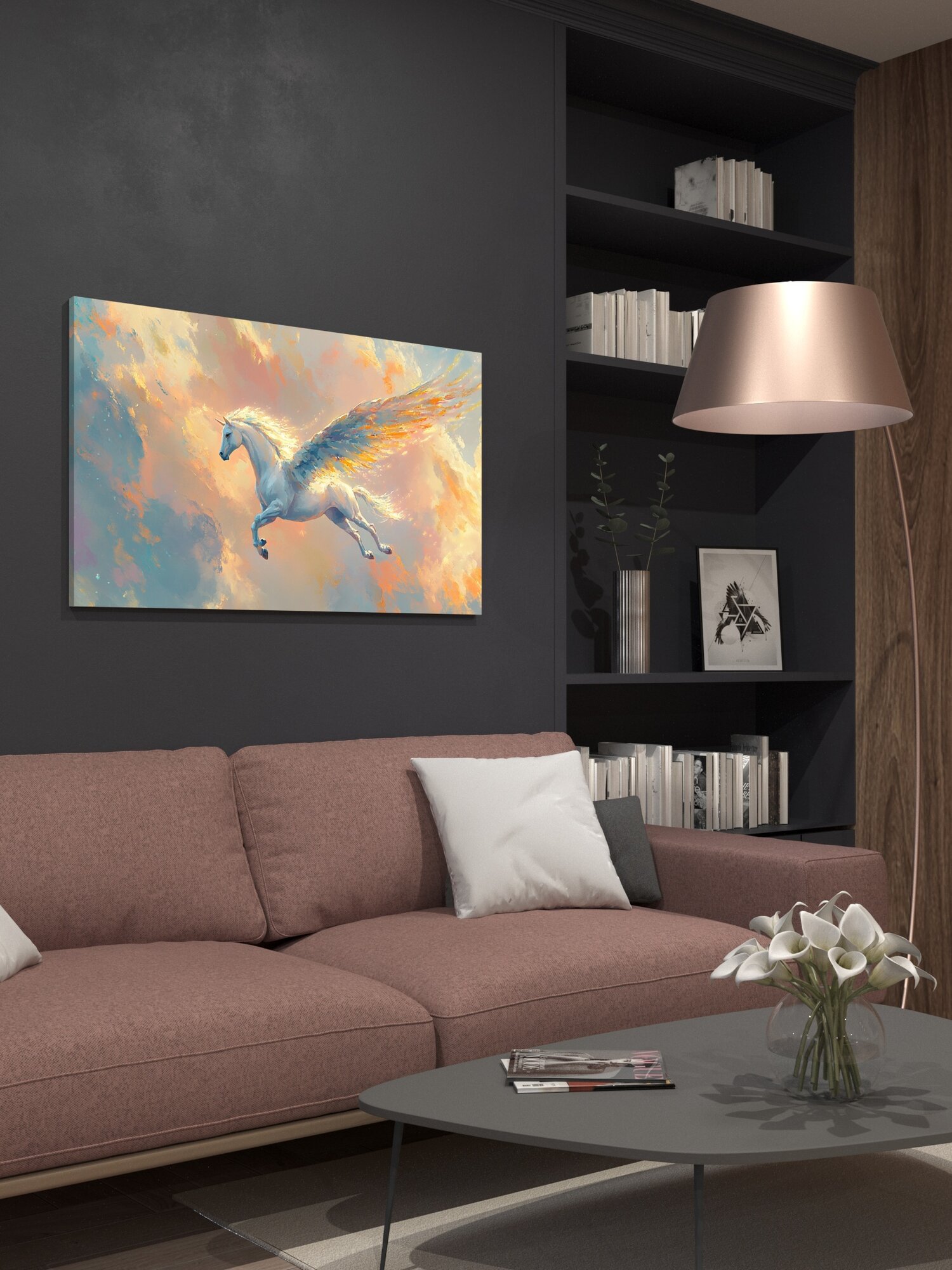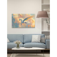 Купить Картина на холсте интерьерная 100х60 см, Пегас, крылатый конь, воздушная картина, утреннее небо, розовый оттенок с доставкой по всей России.
