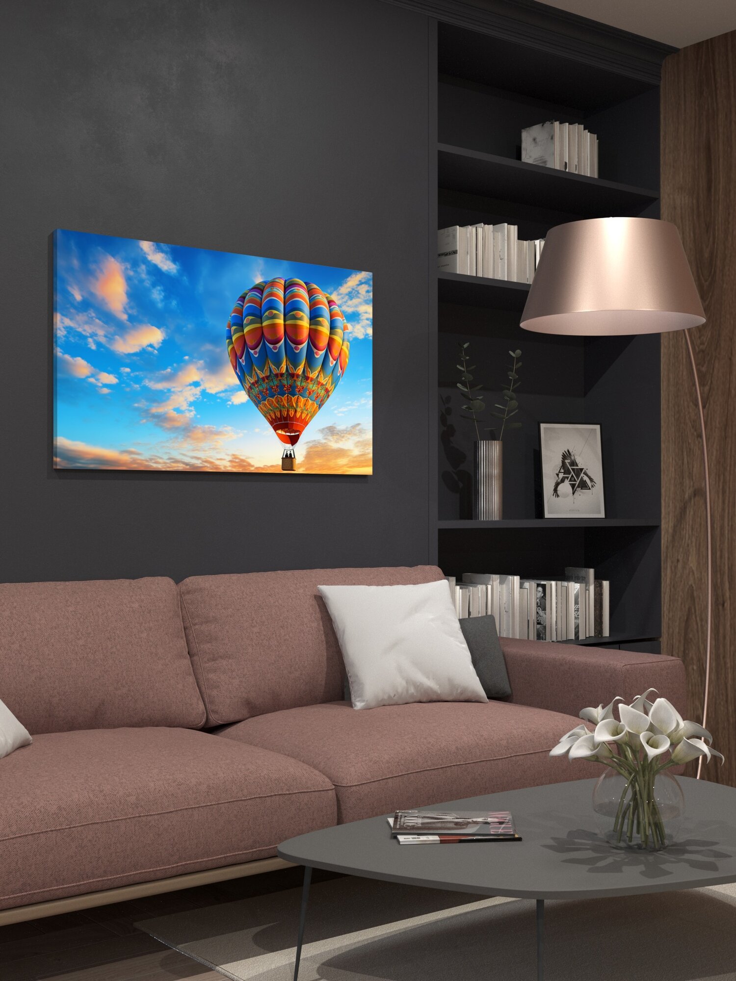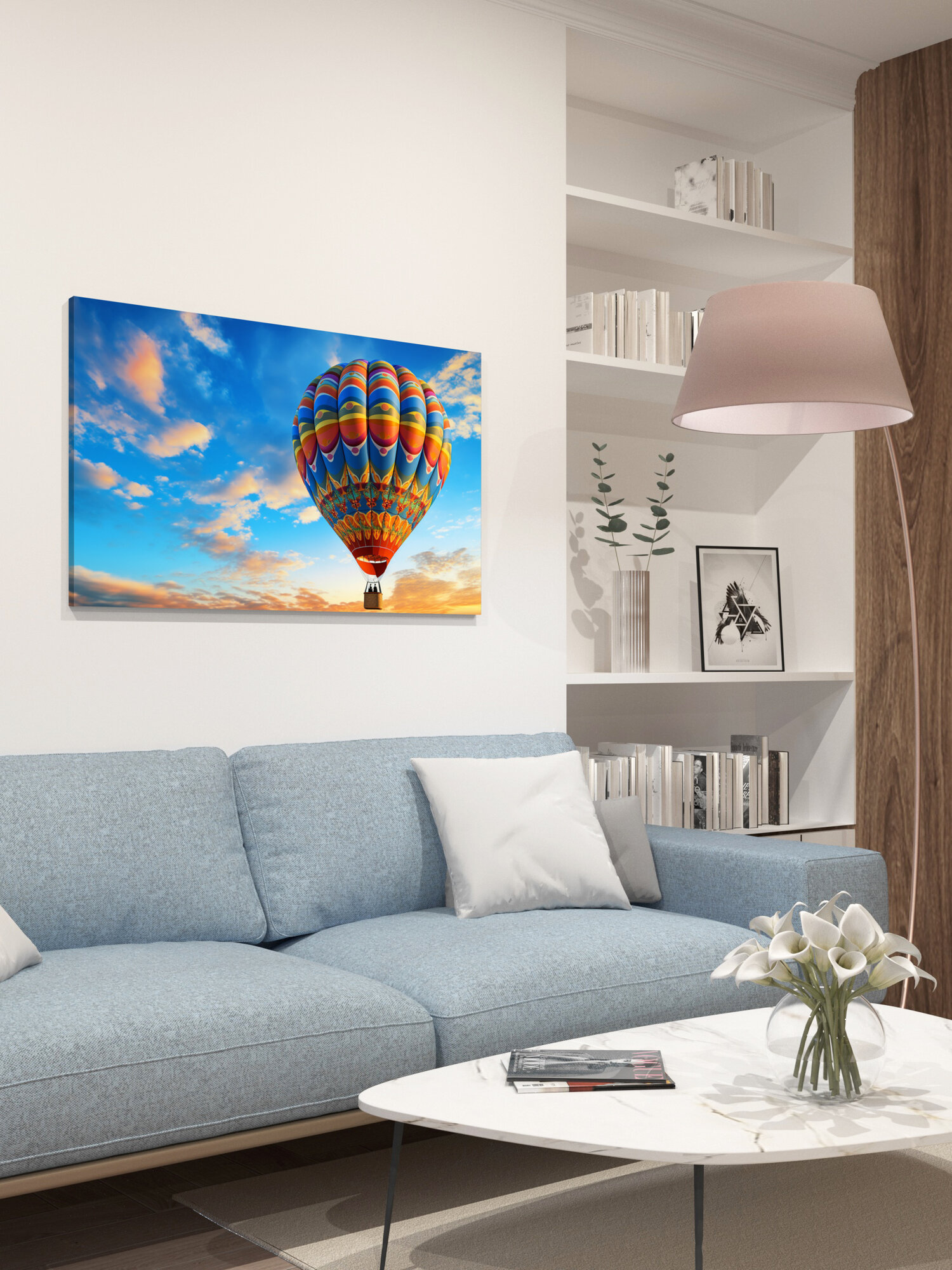 Купить Картина на холсте интерьерная 100х60 см, воздушный шар, небо, голубое небо, яркие цвета, узоры, контраст, композиция с доставкой по всей России.