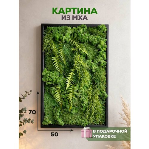 Настенное панно ручной работы из стабилизированного мха ягель и искусственных растений в черной деревянной раме. Живая картина - оригинальный подарок маме, жене или девушке, это прекрасная идея подарка на 8 марта, 14 февраля и день рождения. Стабилизированный мох - натуральный материал, не требующий ухода и полива, сохраняющий свою внешность до 10 лет. Он обработан по специальной технологии, безопасной для здоровья человека, что подтверждено сертификатом качества, поэтому картину можно повесить даже в детскую комнату. Дизайнерская картина подойдет в качестве оригинального подарка, она легко впишется в интерьер в стиле лофт, скандинавский стиль. Панно можно переворачивать, каждый раз меняя восприятие картины. Так как все картины выполнены из природных материалов, композицию картины невозможно повторить точь-в-точь, поэтому каждая картина будет немного отличаться друг от друга. Вы можете комбинировать картины друг с другом, создавая на стене целую экспозицию.