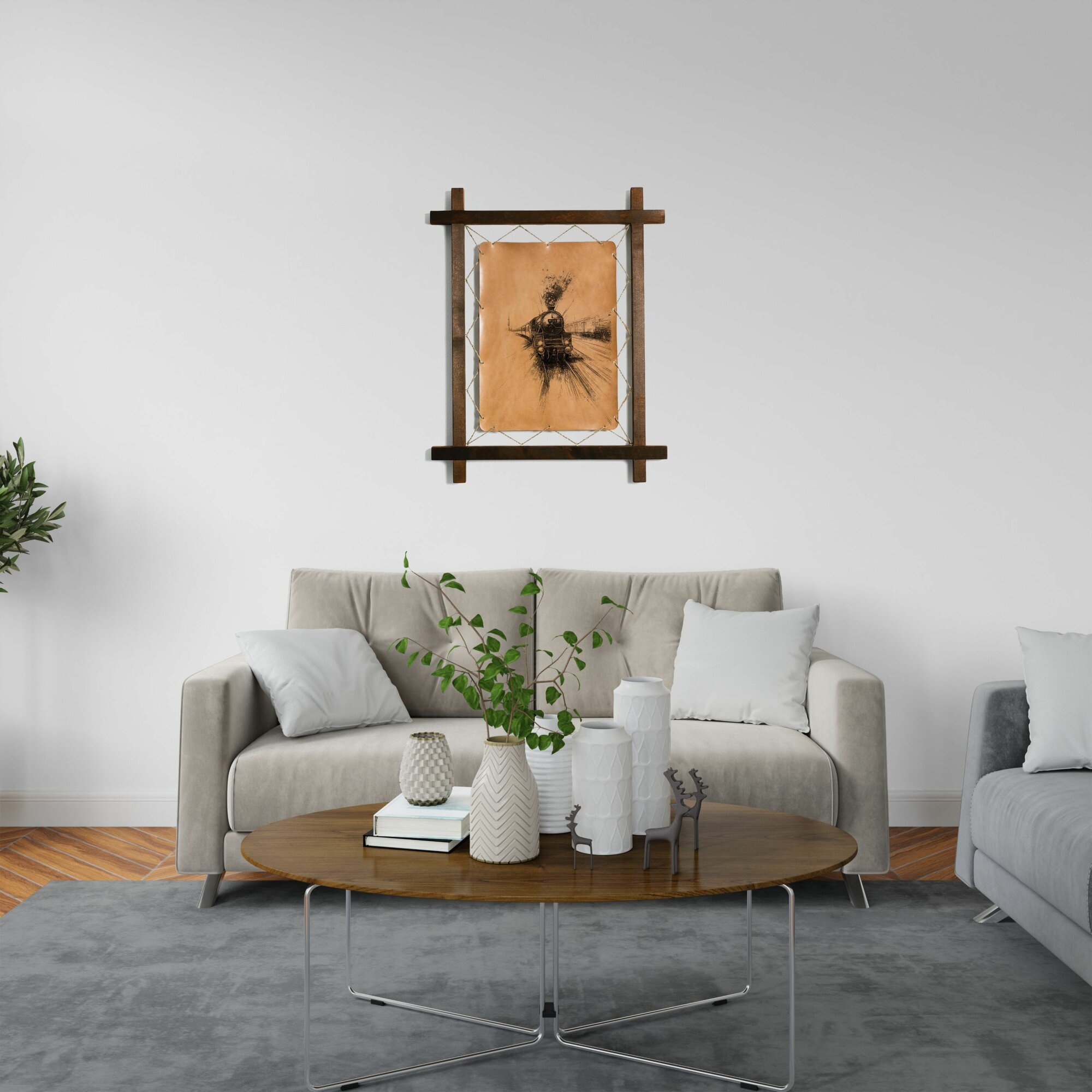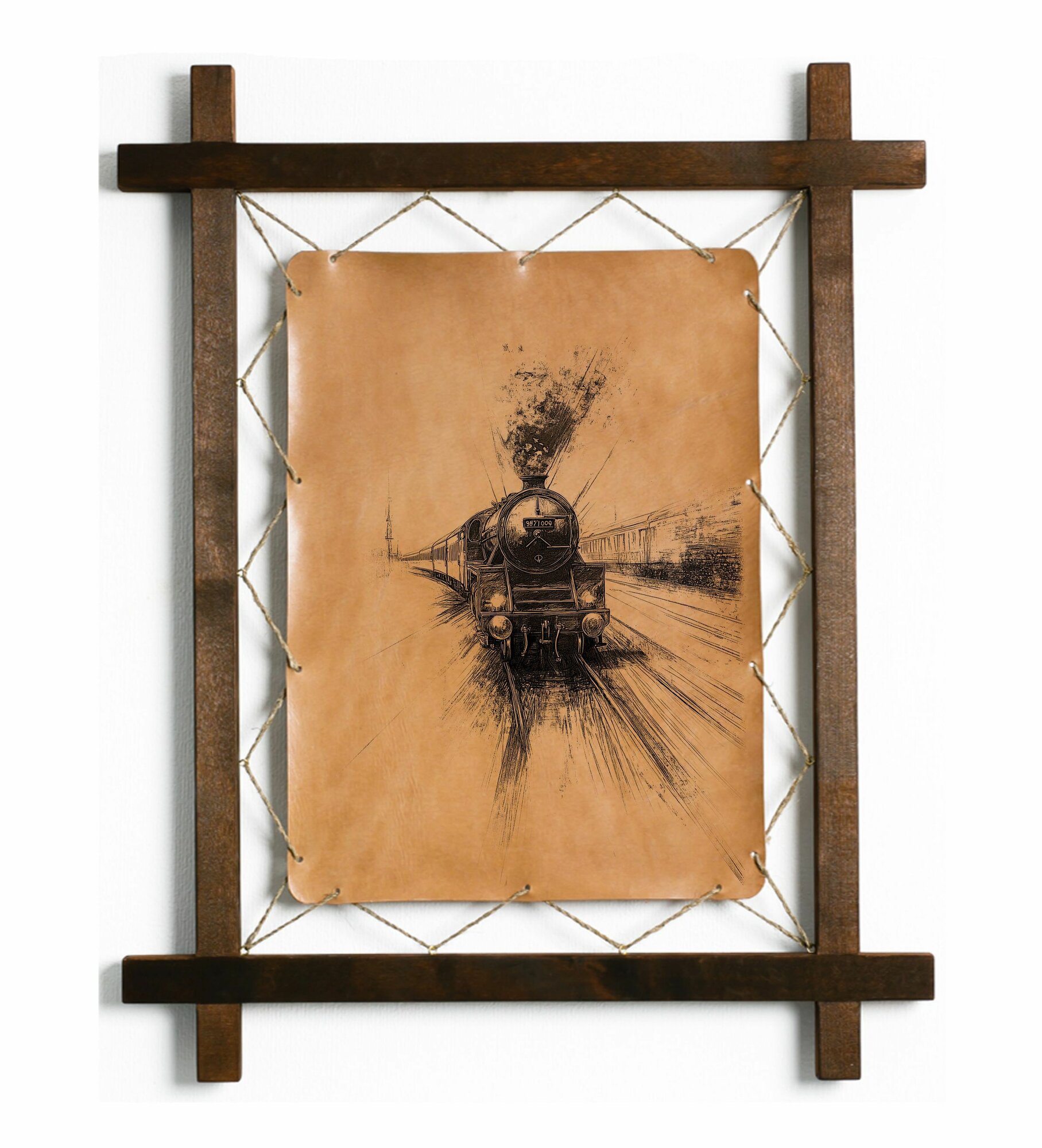 Картина «Паровоз», гравировка на натуральной коже, интерьерная для украшения и декора на стену в деревянной раме, подарок, BoomGift