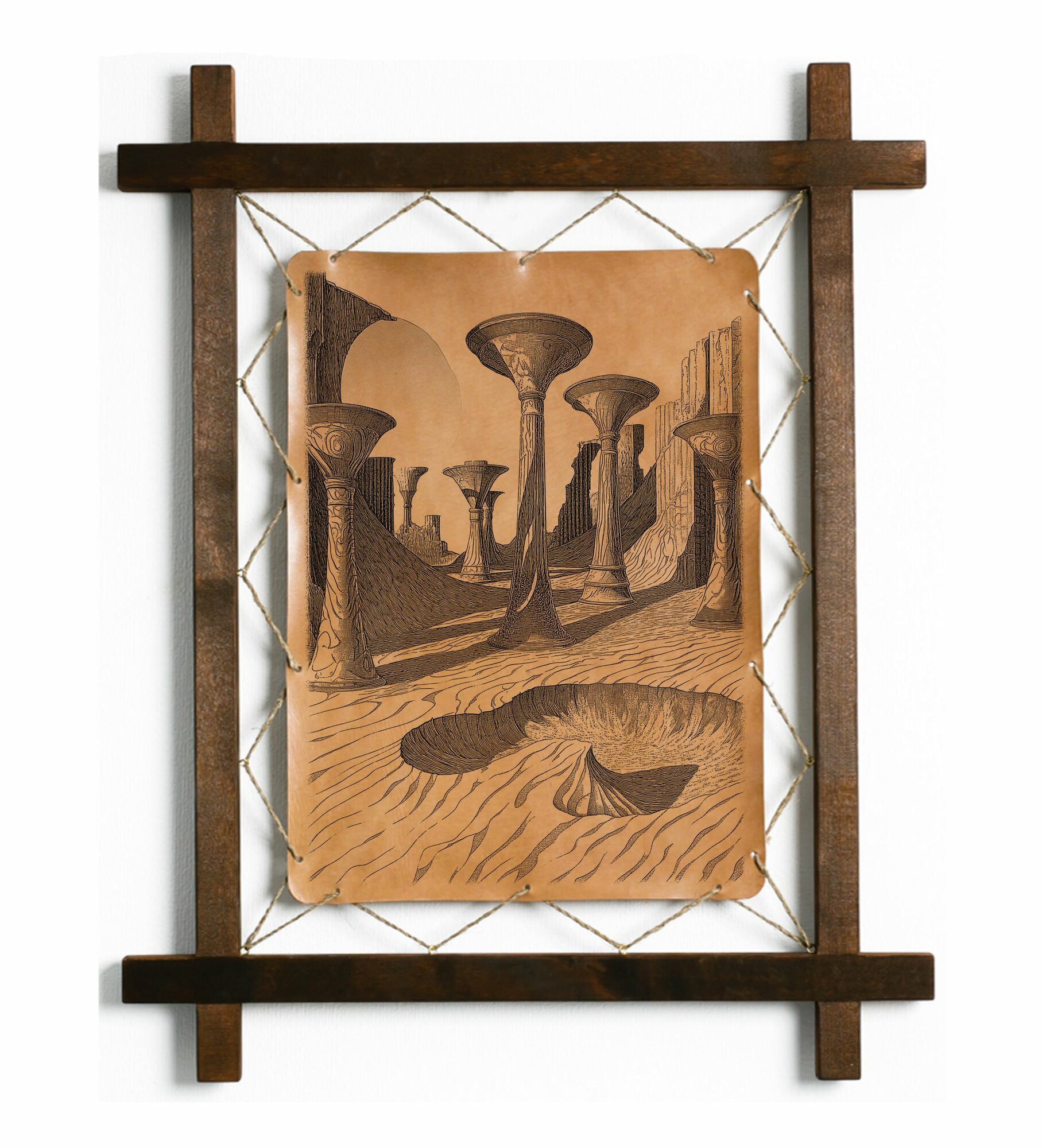 Купить Картина «Пустыня с песочными часами», гравировка на натуральной коже, интерьерная для украшения и декора на стену в деревянной раме, подарок, BoomGift с доставкой по всей России.