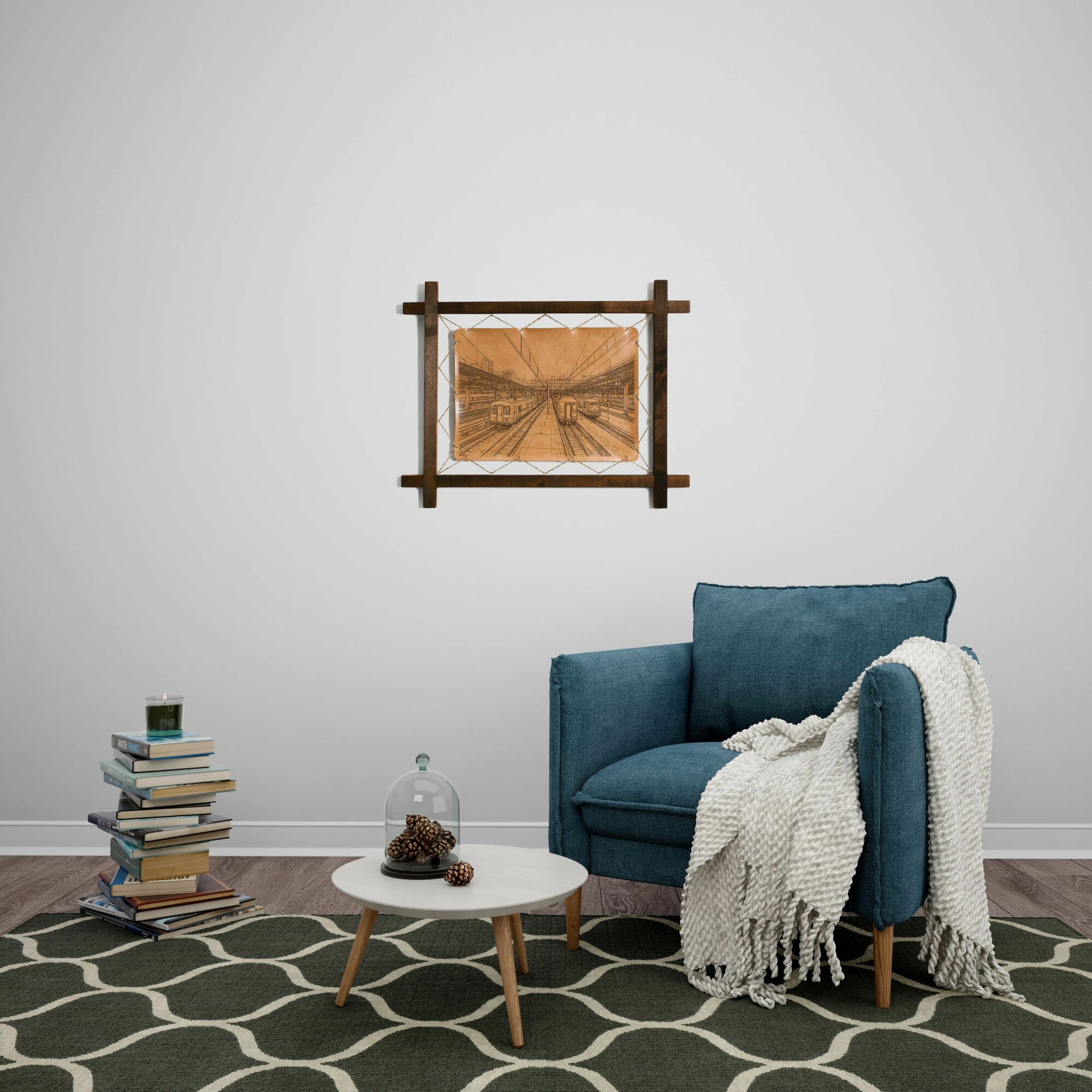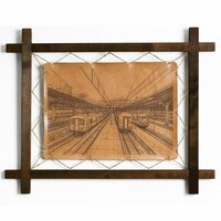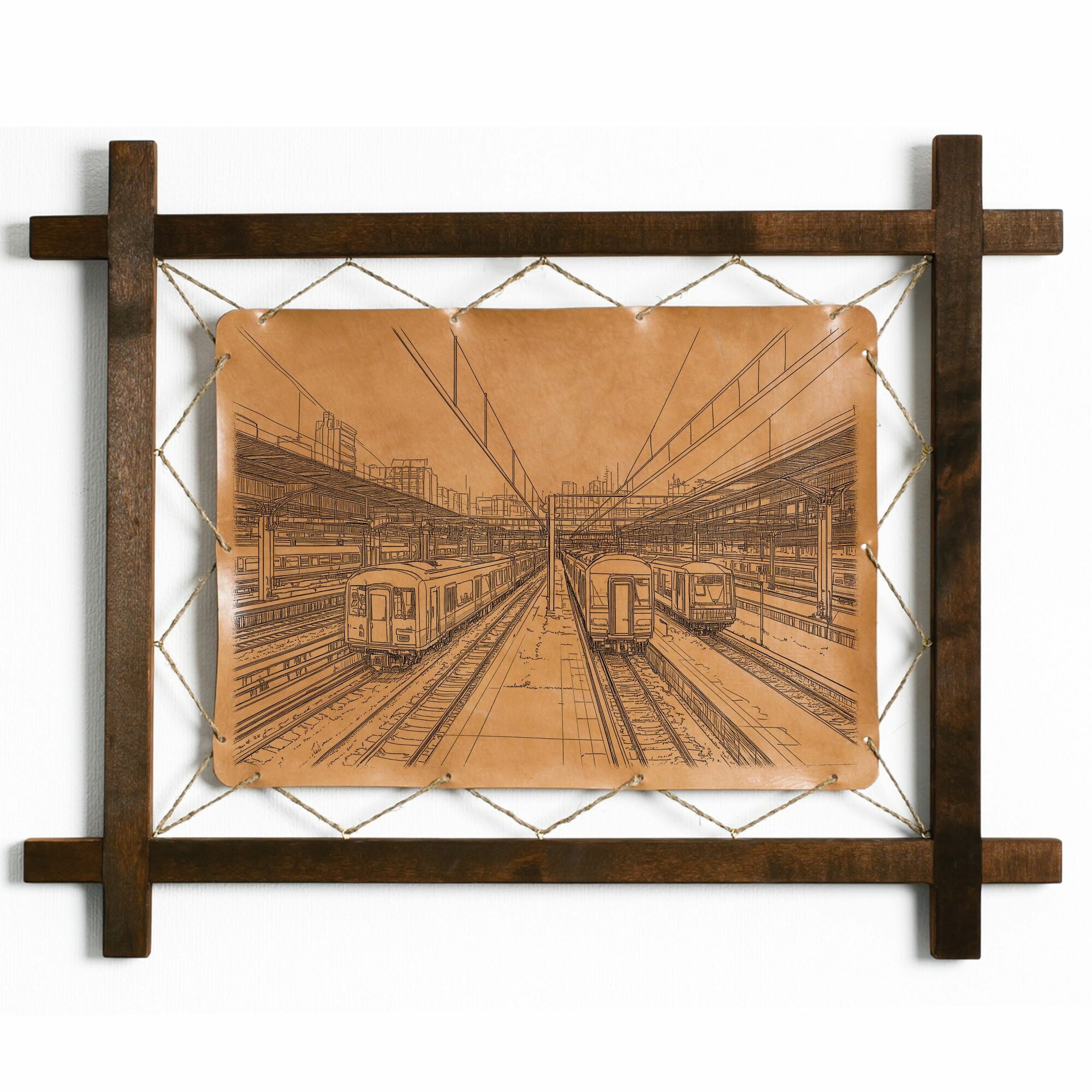 Картина «Товарные поезда на вокзале», гравировка на натуральной коже, интерьерная для украшения и декора на стену в деревянной раме, подарок, BoomGift