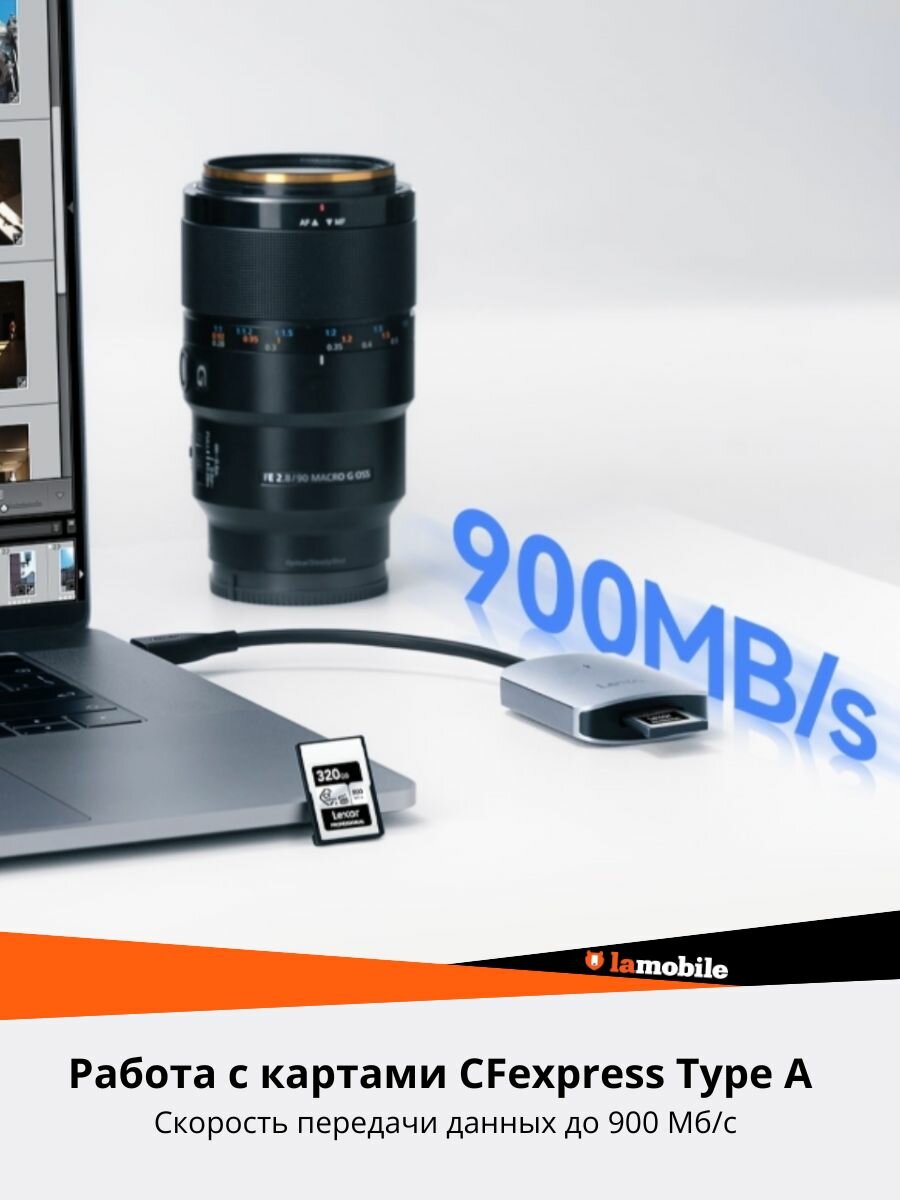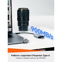 Ключевые преимущества: высокая скорость чтения/записи до 900 МБ/с, поддержка карт CFexpress Type A объемом до 1 ТБ, прочный металлический корпус для защиты данных, универсальное подключение через USB Type-C с переходником Type-A в комплекте, компактный и удобный дизайн для профессионального использования.