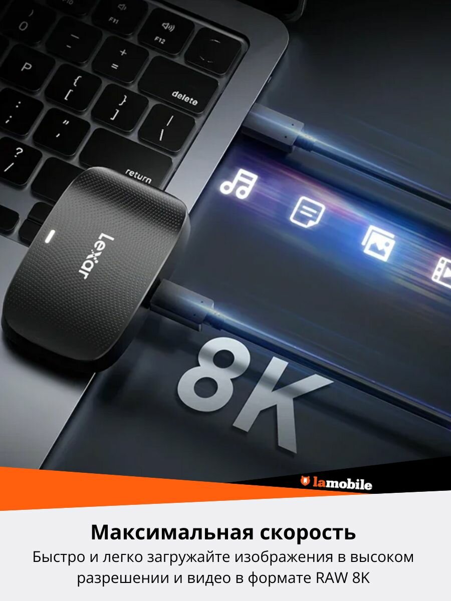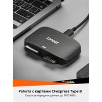 Кард-ридер Lexar для CFexpress Type B и SD с поддержкой высокоскоростной передачи данных до 1050 МБ/с. Идеальное решение для фотографов и видеографов, работающих с контентом в высоком разрешении и RAW 8K. Обеспечивает молниеносную загрузку: для CFexpress Type B – до 1050 МБ/с, для SD – до 312 МБ/с (UHS-II) и 170 МБ/с (UHS-I). Высокая скорость передачи достигается благодаря интерфейсу USB 3.2 Gen 2. В комплекте два кабеля – Type-C/Type-C и Type-C/Type-A – для удобного подключения к любым устройствам. Надёжность, скорость и универсальность в одном устройстве.