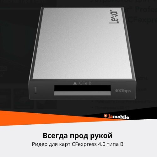Устройство Professional Workflow CFexpress 4.0 Type B для чтения карт памяти от Lexar предназначено для подключения к одному из отсеков для накопителей в док-станции Professional Workflow и Workflow Go через интерфейс USB-C со скоростью 40 Гбит/с. Однако в комплект поставки также входит кабель USB-C — USB-C, позволяющий использовать устройство самостоятельно. Помимо слота для карт CFexpress 4.0 Type B, он также совместим с Windows и Mac, имеет обратную совместимость с CFexpress 2.0 Type B и алюминиевое покрытие, устойчивое к царапинам. Если ваша система не поддерживает стандарт USB4 со скоростью 40 Гбит/с, этот кард-ридер имеет обратную совместимость с USB 2.0 и более поздними версиями, хотя и будет работать с пониженной скоростью передачи данных, соответствующей этим стандартам.