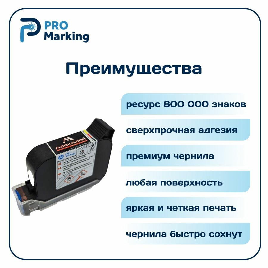 Картридж высококачественный продукт от производителя MarkMann. Заправлен сольвентными чернилами белого цвета. Подходит для ручного маркиратора типоразмера 2588, 2588+. Чернила водостойкие - не смываются водой, обладают сверхпрочной адгезией, что обеспечивает четкую и яркую печать на любой поверхности. Высота печати картриджа - 12,7 мм, а разрешение - 600 DPI. Картридж можно перезаправлять, что позволяет значительно сэкономить. Сольвентные чернила картриджа MarkMann быстро сохнут. В картридже используется технология HP, что гарантирует высокое качество и долговечность печати. Емкость картриджа составляет 42 миллилитра, ресурс картриджа - 800 000 символов, благодаря чему широко используется в различных областях, таких как маркировка товаров, упаковки, этикеток и т. д. Картридж сольвентный для датера MarkMann обеспечивает высокую производительность и долговечность, а также возможность использования на любой поверхности, что делает его универсальным и удобным в использовании.