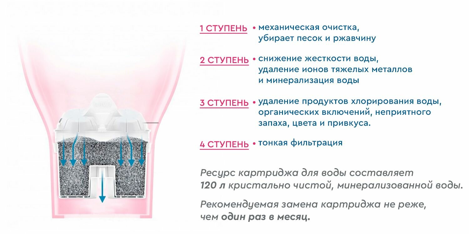 Ресурс картриджа для воды составляет 120 л кристально чистой, минерализованной воды. Этого хватит на 30 дней.