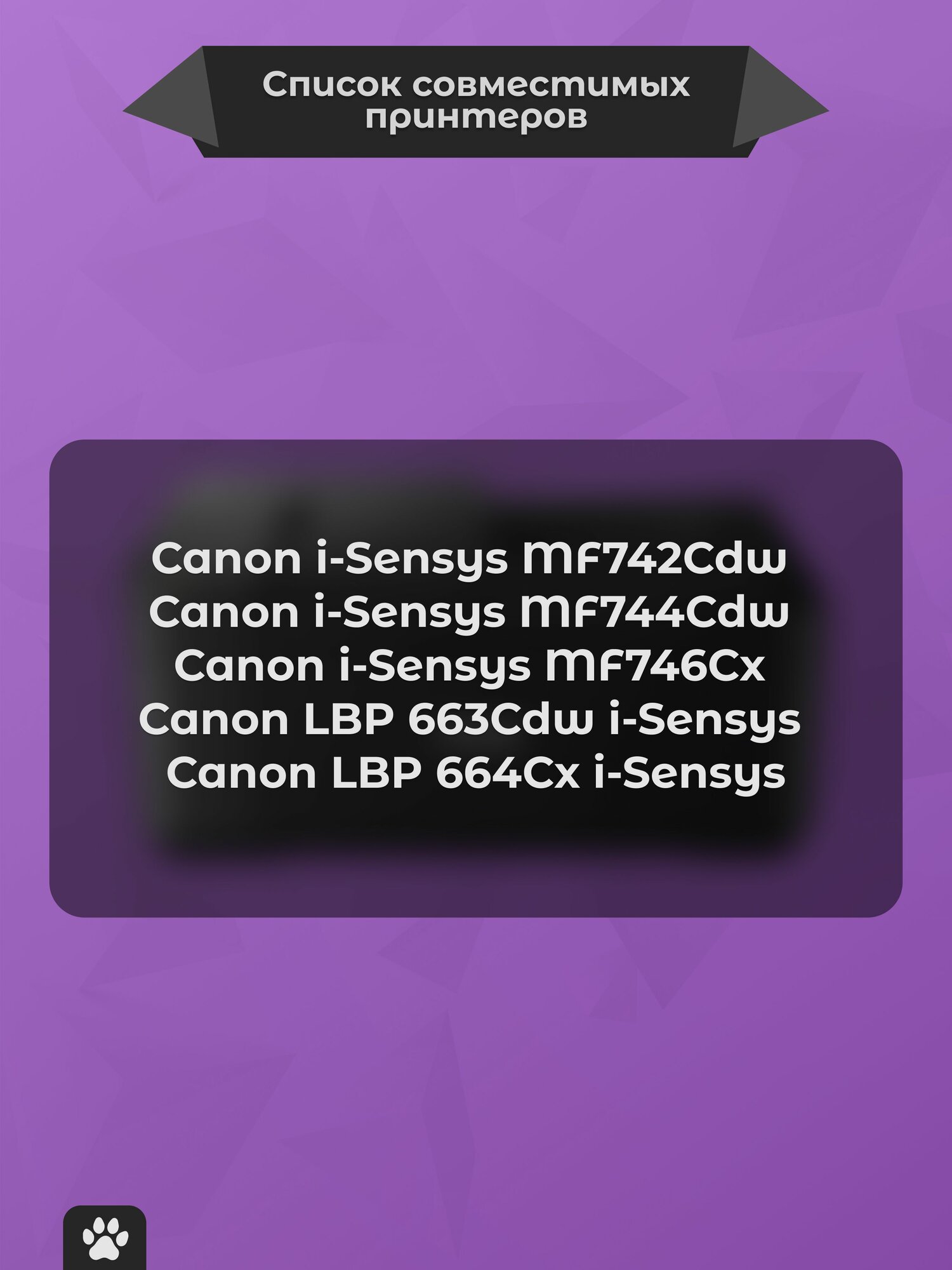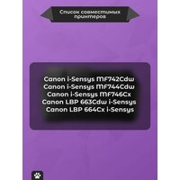 Продукция поставляется вместе с чипом, что обеспечивает простую установку и перезаправку при необходимости. Вы можете быть уверены в высокой производительности устройства, так как расходник подходит для множества моделей мфу, включая MF742Cdw и MF744Cdw.