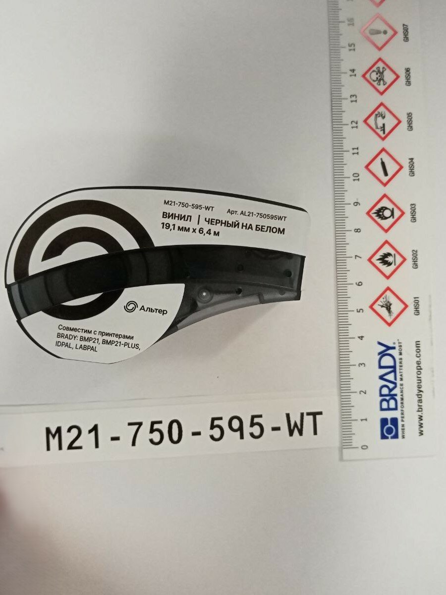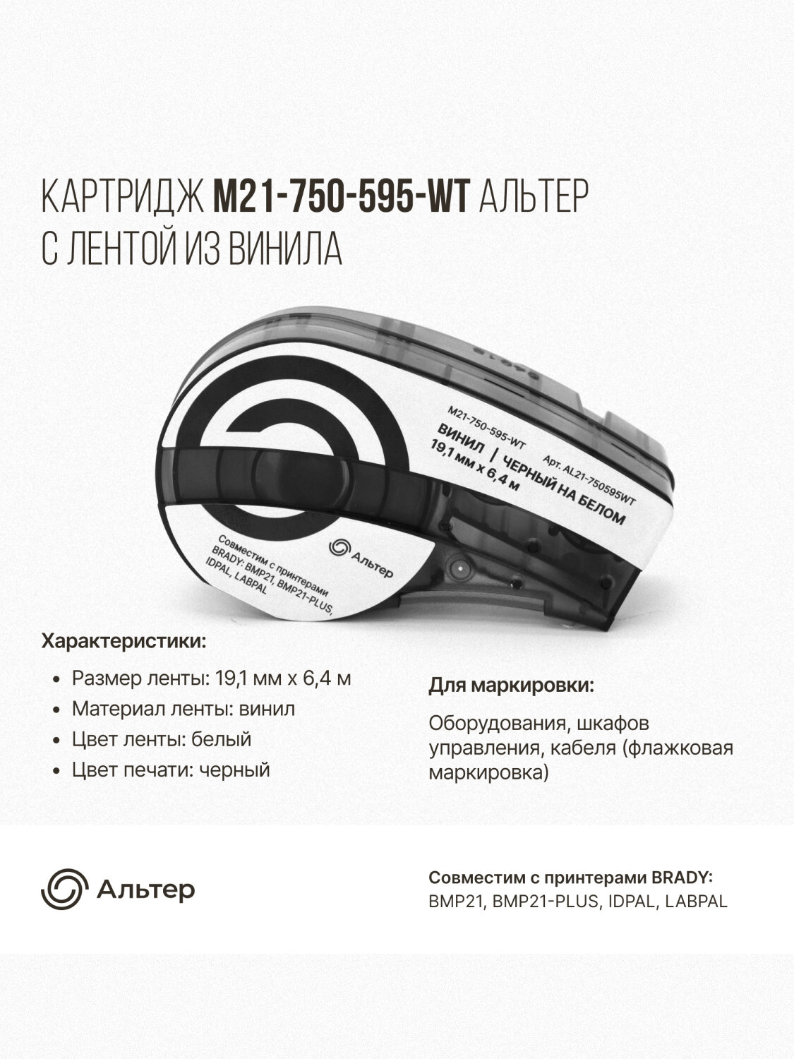 Картридж M21-750-595-WT Альтер с лентой из винила 19,1 мм х 6,4 м, черный на белом, для принтеров BRADY: сравнение цен, характеристики, фото, актуальное наличие и цены.
