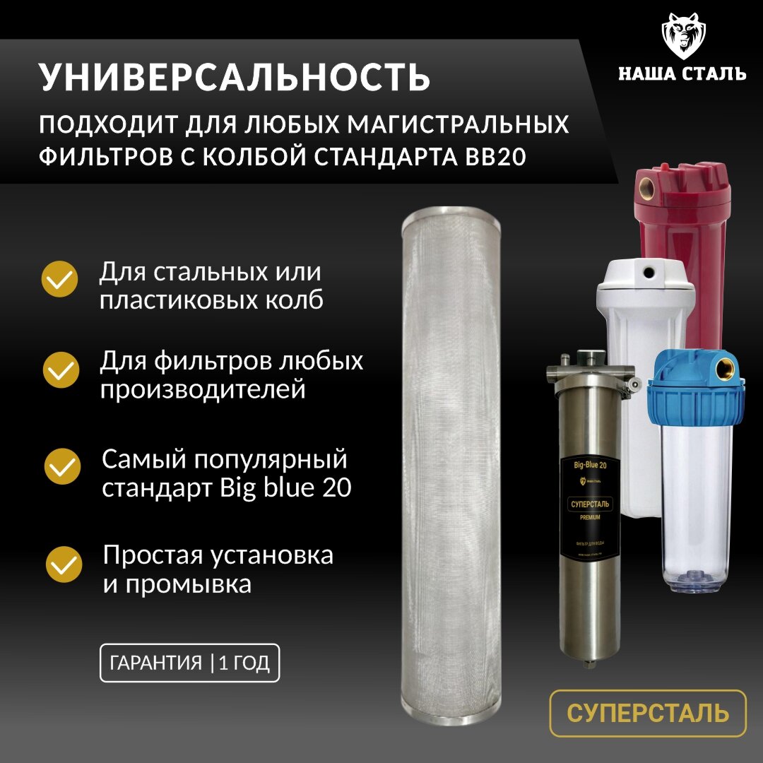 Универсальный, подходит для всех типов колб магистральных фильтров ВВ20, любых производителей. Не требует замены, промывается и используется многократно!