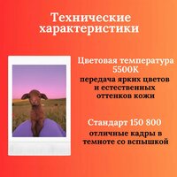 Общий размер карточки: 86х54 мм, размер изображения: 62х46 мм. ISO 800, цветовая температура - 5500 К (солнечный свет или вспышка), температурный диапазон для хранения и использования: 5-40° C (перегрев или заморозка крайне отрицательно сказываются на качестве изображения). Тип поверхности - глянцевая. Белое поле для подписи.