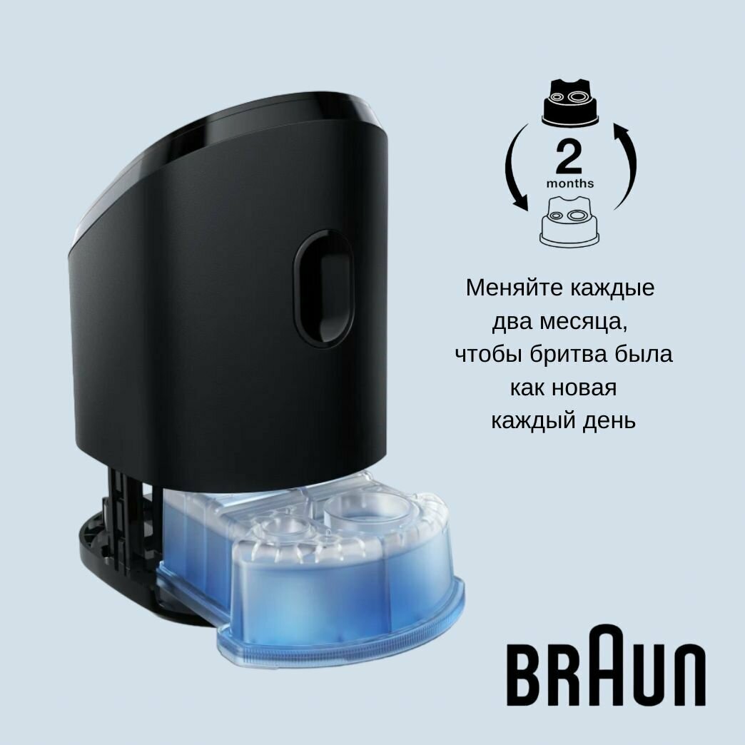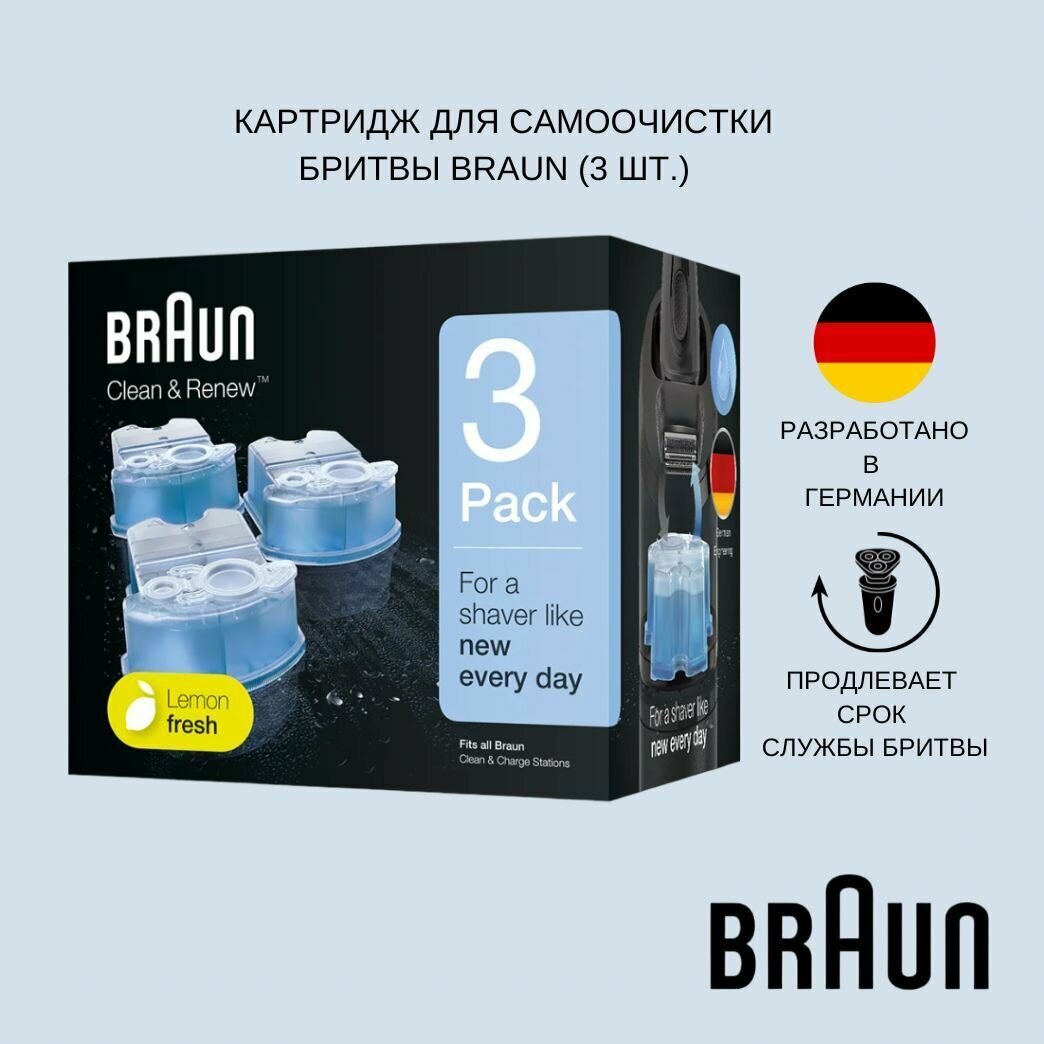 Картриджи Braun Clean&Renew для станций очистки и подзарядки CCR - 3 шт по 170 мл. Картриджи Clean&Renew поддерживают бритву Braun в оптимальном состоянии, обеспечивая эффективность и комфорт каждой процедуры бритья. Жидкость с ароматом лимона обеспечивает смазывание лезвий электробритвы и дарит ощущение свежести во время бритья. Специальная жидкость удаляет 99,9 % всех микробов, обеспечивая до 10 раз более гигиеничное очищение, чем промывание бритвы под проточной водой.