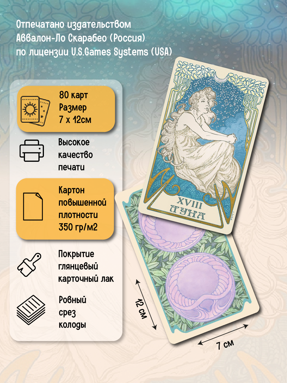 Гадальные Карты Таро Эфирных Видений это колода, пронизанная светом. Создавая эту колоду Мэтт Хьюз черпал вдохновение из художественного направления модерн, переняв его особый стиль и тщательный подход к искусству. Кроме того, художник создал две карты в дополнение к традиционным Старшим Арканам. Все изображения в колоде нарисованы и раскрашены вручную, тиснение золотой фольгой придает картам благородный и утонченный вид. Универсальные карты связаны с классическими традициями Райдера Уэйта и совсем не похожи на Таро Тота Алистера Кроули. Карты отлично подойдут не только опытным, но и начинающим тарологам. Колода состоит из 80 карт, выполнены из высококачественного картона, в комплекте идет русскоязычная инструкция, прочный короб для хранения. Набор из универсальных таро карт станет отличным подарком подруге, женщине, любимой девушке и всем, кто увлекается магией, эзотерикой, гаданиями на любовь, метафорическими ассоциативными картами, картами оракул Ленорман. В нашем магазине вы так же можете приобрести: Таро Небо и Земля, Таро Безумной Луны, Колесо Года, 78 Дверей, Руны, книги и др. аксессуары эзотерики и магии. Издательство Аввалон-Ло Скарабео (Россия).