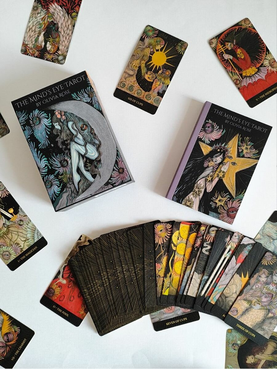 Колода карт таро «MIND'S EYE» приглашает вас отправиться в приключение духа, позволяя вашему воображению быть вашим надежным проводником. В своих сюрреалистичных красочных работах с использованием чая и золотых чернил Оливия Роуз передает интуитивный творческий процесс, который вдохнул жизнь в Таро «MIND'S EYE» и наполнил его позитивной энергией. 78 карт без рамок побуждают нас погрузиться глубоко в наши собственные эмоции, чтобы проникнуться историями и символикой Таро и раскрыть их значения и послания. .