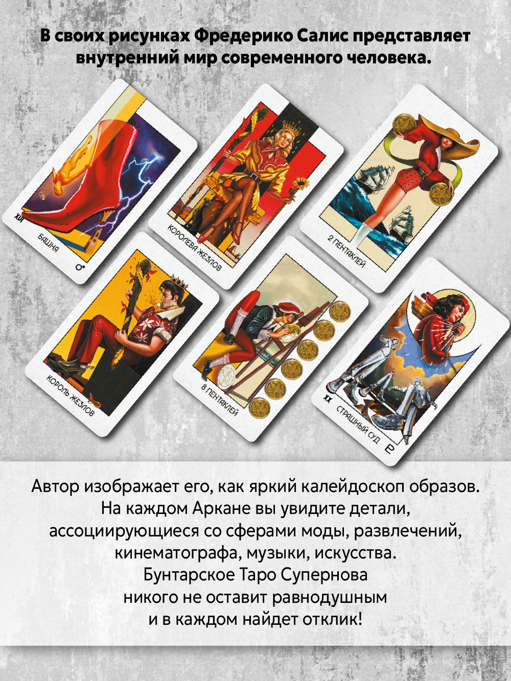 Гадальная колода Карты Таро Супернова (оригинальное название Supernova tarot) Обновленная русская серия! Издательство Аввалон-Ло Скарабео (по лицензии Lo Scarabeo) Рубашка симметричная. Инструкция электронная по QR-коду. Автор Федерико Салис, Элис Мастролио Школа Таро Уэйта. Покрытие глянцевый карточный лак/ Материал карточный картон. Плотность картона 300гр/м2 Вес колоды 195 гр Коробка для хранения - стандартная картонная О колоде: Стильное, острое, бунтарское – все эти определения подходят к Таро Супернова от Федерико Салиса. Его оригинальный дизайн карт с экстравагантными персонажами, отсылками к поп-музыке, четкой манерой рисунка и яркой цветовой палитрой привносят свежий, инновационный взгляд в традиционную структуру Таро. В результате получилась колода с ярко выраженной индивидуальностью и изюминкой, которая, несомненно, обогатит Таро особым смыслом.