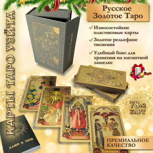 Пластиковые карты с золотым тиснением и рельефной поверхностью с 3D-эффектом - необыкновенно красивые, приятные на ощупь, небольшой толщины, гибкие и эластичные, водонепроницаемые и износостойкие, легко тасуются. Золотая текстура карт, переливается под различным углом, притягивает и удерживает внимание. Изготовленные из прочного пластика с золотым тиснением и рельефной поверхностью, карты имеют высочайшую степень устойчивости к износу, легко восстанавливают свою форму при изгибе и не боятся влаги. Прочный бокс-кейс станет удобным футляром для хранения карт. Для лучшей сохранности при доставке к Вам гадальный комплект мы дополнительно упаковываем в картонную гофрокоробку для защиты от повреждений при транспортировке.
