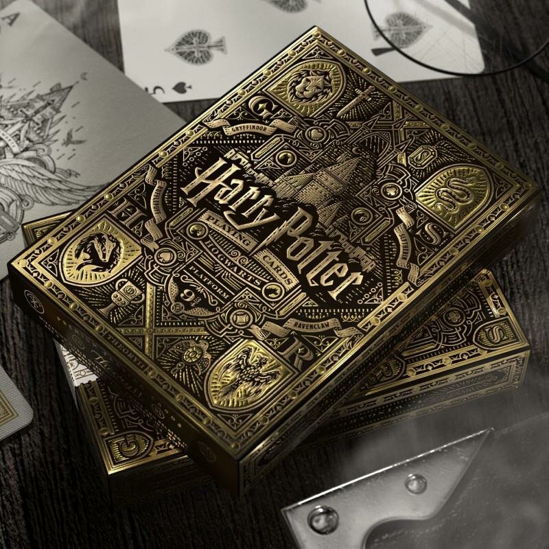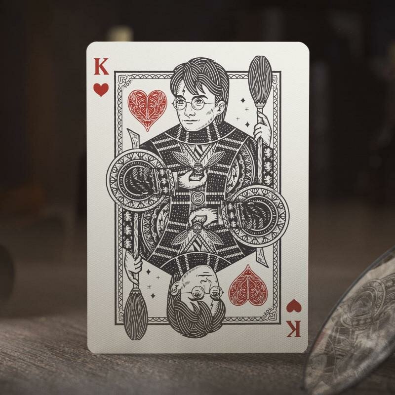 Грамотный подход к украшению заметен уже с коробки, на которой красуется Хогвартс, а также гербы всех 4 факультетов волшебников. Выполнено оформление методом теснения с использованием золотой фольги. Данная колода относится к дому Пуффендуй, поэтому основным цветом выбран жёлтый. Изображения на картах были заменены на более подходящие по тематике, например – Гарри Поттер в виде Короля. Детализация рисунков максимальная, поэтому даже просто рассматривать их уже приятно.