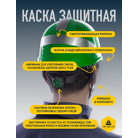 Защитная каска из термопластика АБС в виде бейсболки с козырьком, Внутренняя оснастка из полиамида: 3 текстильных ремня с 8 точками крепления, Комплектуется 4-х точечным подбородочным ремнем, Потовпитывающая вставка на лобовой части оголовья, Карманы для крепления очков, наушников, щитков, Регулируется по обхвату головы от 53 до 63 см при помощи инновационной системы затяжения ROTOR®, 2 возможных позиции размещения на голове: высокая и низкая, Защита против бокового сжатия, Стойкость к брызгам расплавленного металла, Защита против случайного кратковременного контакта с электрическим проводником под напряжением 440 В переменного тока, Светоотражающая полоса сверху и по периметру каски, Температурный диапазон применения касок от - 30°C до + 50°C, Вес каски – 412 гр,