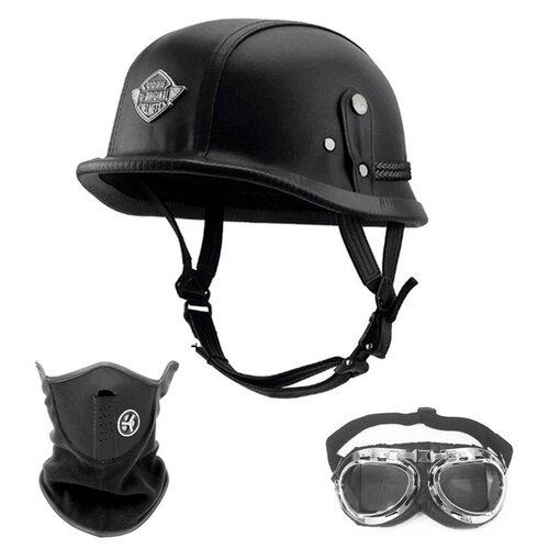 Каска в стиле милитари для мотоцикла, подойдет как для опытного, так и для начинающего байкера. Форма изделия немного напоминает немецкую военную каску М35. В комплекте с каской поставляется ветрозащита на нижнюю часть лица и мотоциклетные очки. Комплект прекрасно подойдет для поездок на ретробайках и скутерах с максимальной скоростью до 90 км/ч, для поездок на природу или для байкерских фестивалей. Размер XL (61-62см). Каска изготовлена из прочного АВС-пластика, с полной отделкой из эко-кожи. С внутренней стороны предусмотрена мягкая подкладка. Ремешки регулируются, чтобы можно было добиться плотного примыкания каски к голове.