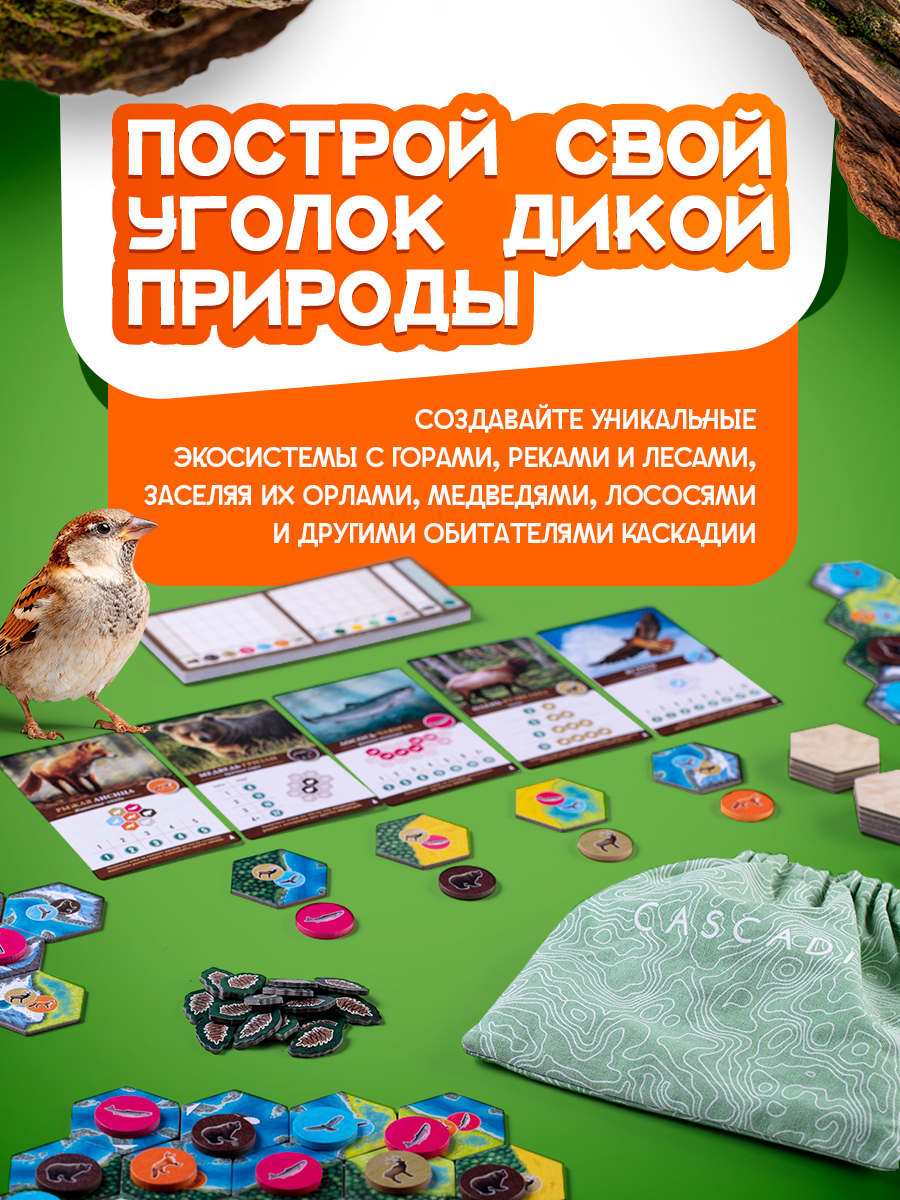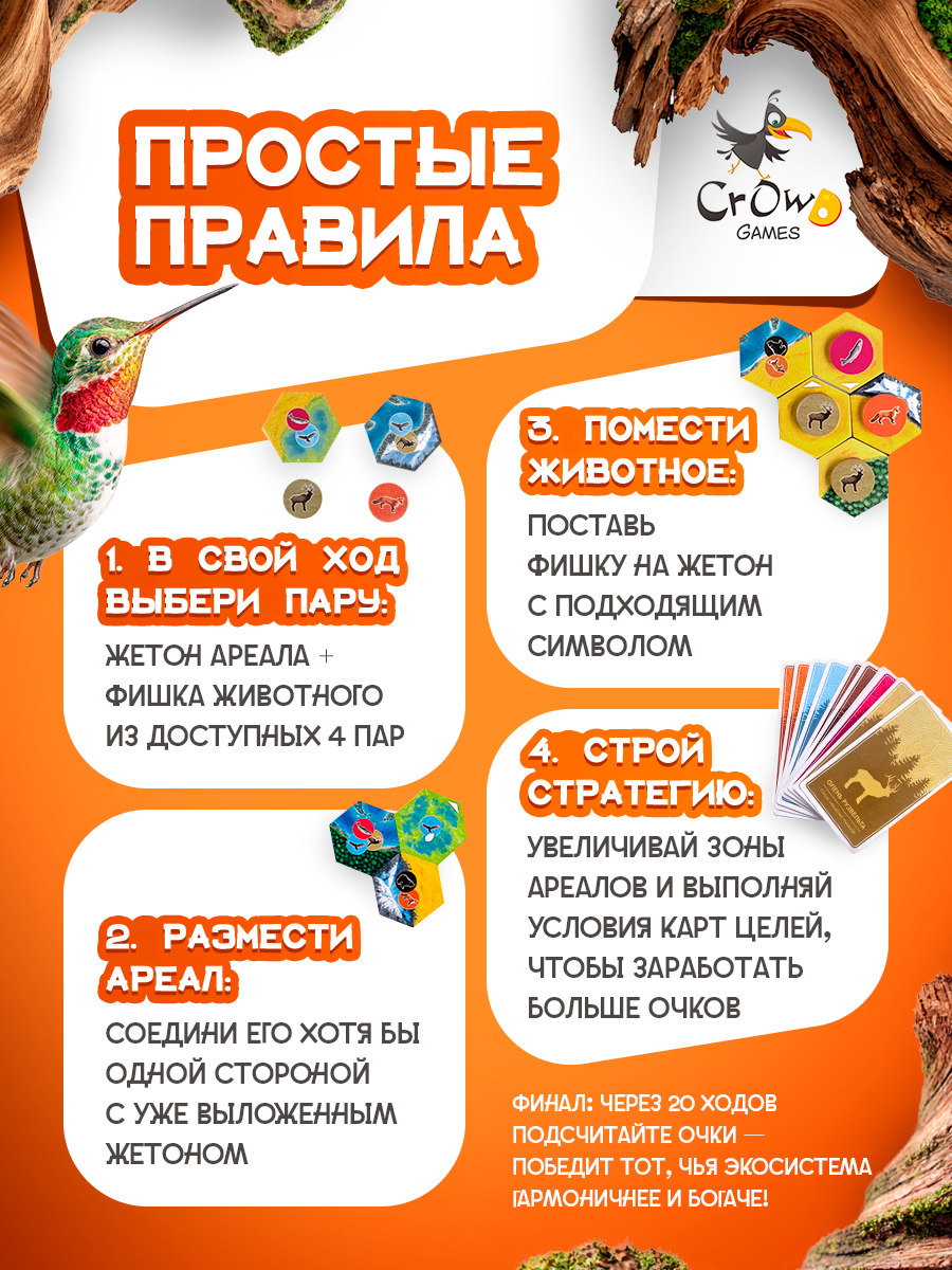 Игра входит в топ-10 абстрактов мира. В ней и начинающим игрокам, и опытным настольщикам предлагается решить увлекательную головоломку в безмятежных лесах Тихоокеанского Северо-Запада. Участники будут создавать многообразную и гармоничную экосистему, населяя созданные ими ареалы разными животными. Каждый вид животных имеет различные требования к ареалам, а каждый ареал должен быть размещён так, чтобы получались протяжённые природные зоны, приносящие победные очки. В каждой партии случайным образом выбираются карты целей. В центре стола формируется рынок из четырёх жетонов ареалов и четырёх фишек животных. В свой ход игрок должен выбрать пару: жетон ареала и фишку животного. Если на рынке лежит 4 одинаковые фишки животных, он обязан обновить ряд. Если одинаковых фишек только 3, решение обновить ряд остаётся за игроком. Кроме того, игрок может потратить жетон природы, чтобы обновить любое количество фишек или взять любой из 4 жетонов ареалов и любую из 4 фишек животных. После этого игрок добавляет жетон и фишку в свою экосистему в любом порядке. Жетон ареала добавляется так, чтобы он соприкасался с хотя бы одним из уже существующих жетонов экосистемы. Совмещать одинаковые ареалы обитания не обязательно, но в конце игры самые протяжённые ареалы принесут победные очки. Фишку животного игрок помещает на любой пустой жетон ареала в своей экосистеме, на котором изображён символ соответсвующего животного. Когда игрок помещает животное на жетон заповедника, он тут же получает один жетон природы, который сможет использовать со следующего хода. Игроки ходят до тех пор, пока не опустеют стопки жетонов и в игровую зону нельзя будет выложить новый жетон ареала. Победителем объявляется игрок с наибольшим количеством победных очков. Хотя правила весьма просты, игра предлагает несколько уровней сложности, чтобы даже самые опытные игроки возвращались к ней снова и снова.