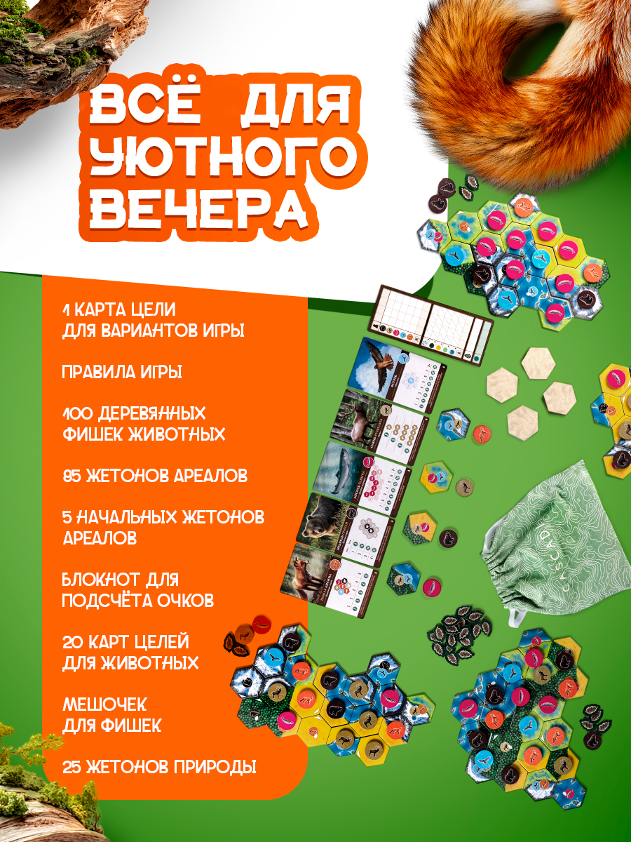 100 деревянных фишек животных, 85 жетонов ареалов, 5 начальных жетонов ареалов, 25 жетонов природы, 20 карт целей для животных, 1 карта цели для вариантов игры, блокнот для подсчёта очков, мешочек для фишек, правила игры.