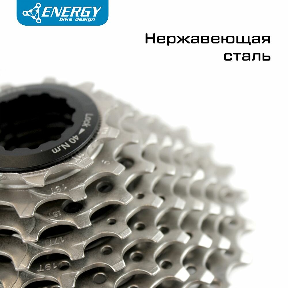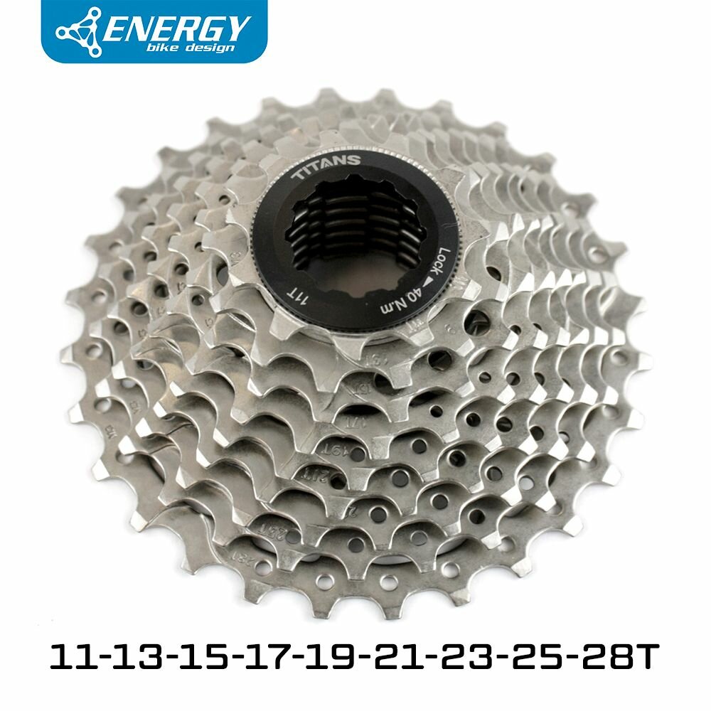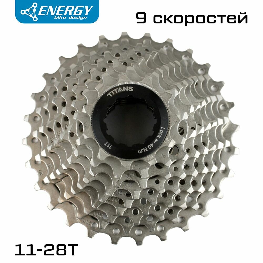 Кассета велосипедная Energy, 9 скоростей, 11-28T, HG Type, стальная. Кассеты Energy серии Titans — настоящие титаны в мире велосипедных трансмиссий! Звезды кассеты сделаны из высокопрочной стали и обладают высокой износостойкостью. Кассета рассчитана на длительное использование, в том числе в условиях повышенного загрязнения. Профиль зубов спроектирован с помощью компьютерного моделирования, а расстояние между звездами идеально откалибровано для максимально четкого переключения.