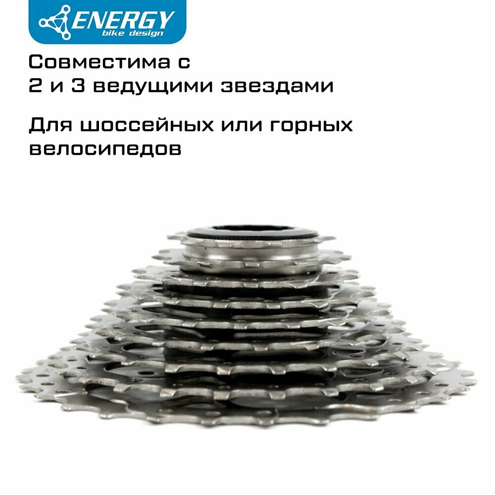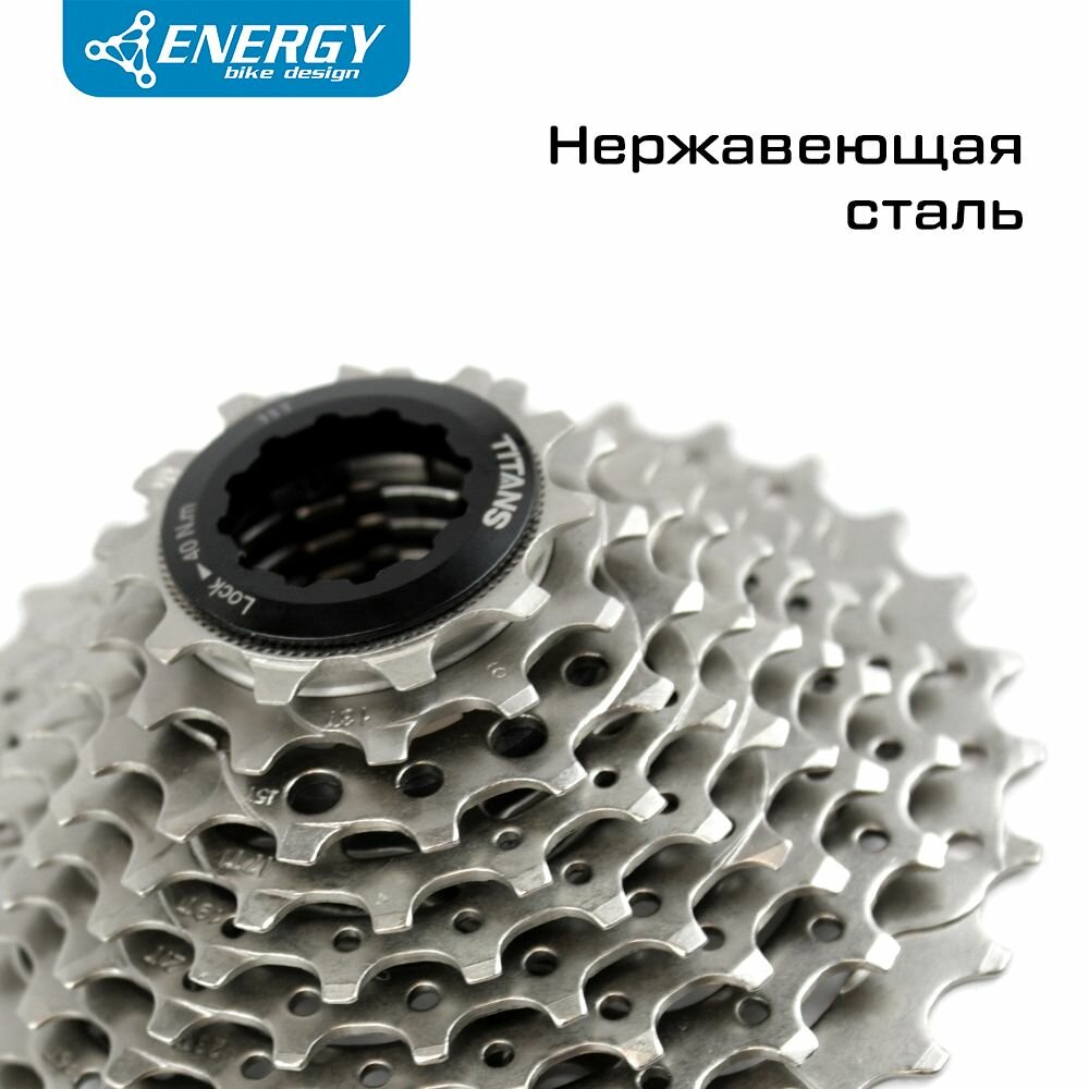Кассета велосипедная Energy, 9 скоростей, 11-30T, HG Type, стальная. Кассеты Energy серии Titans — настоящие титаны в мире велосипедных трансмиссий! Звезды кассеты сделаны из высокопрочной стали и обладают высокой износостойкостью. Кассета рассчитана на длительное использование, в том числе в условиях повышенного загрязнения. Профиль зубов спроектирован с помощью компьютерного моделирования, а расстояние между звездами идеально откалибровано для максимально четкого переключения.