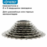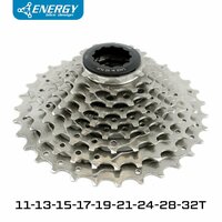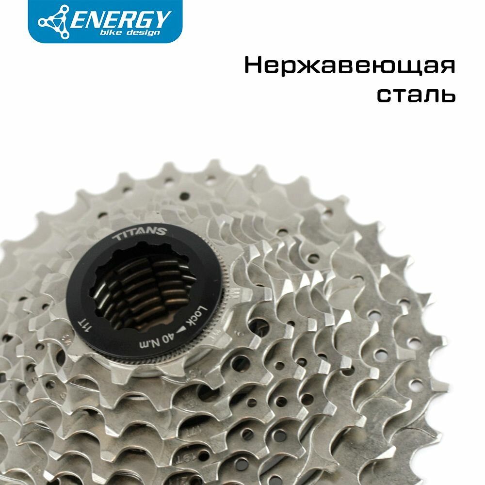 Кассета велосипедная Energy, 9 скоростей, 11-32T, HG Type, стальная. Кассеты Energy серии Titans — настоящие титаны в мире велосипедных трансмиссий! Звезды кассеты сделаны из высокопрочной стали и обладают высокой износостойкостью. Кассета рассчитана на длительное использование, в том числе в условиях повышенного загрязнения. Профиль зубов спроектирован с помощью компьютерного моделирования, а расстояние между звездами идеально откалибровано для максимально четкого переключения.